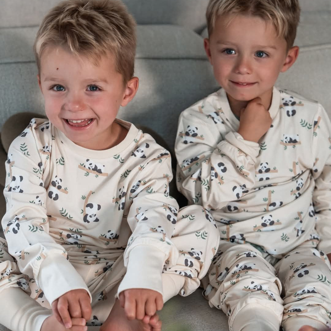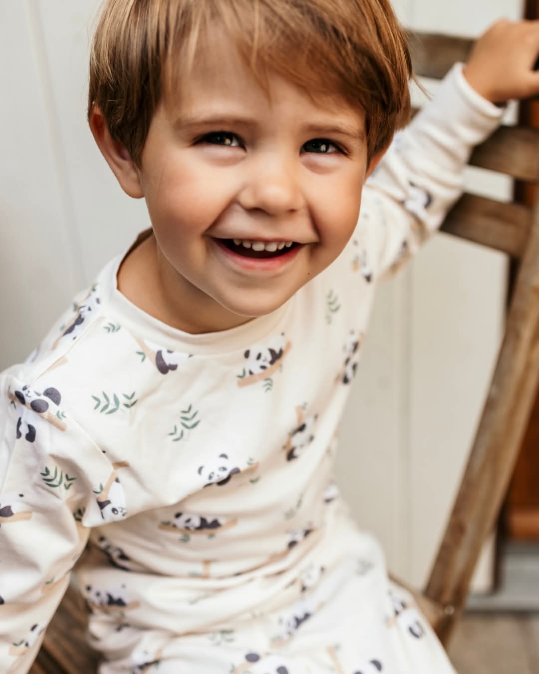 Two-piece pajamas in soft and comfortable bamboo. The pajamas consist of a pair of trousers with elastic at the waist and wide cuffs and a long-sleeved shirt also with cuffs. Bamboo is an environmentally friendly choice of material, it is grown completely organically without pesticides and is 100% biodegradable. Bamboo is smooth and comfortable against the skin and allows the skin to breathe. Its thermal properties are the same as wool and silk, making the material feel warm when it's cold and cool when it's warm - a perfect material for children's clothing.