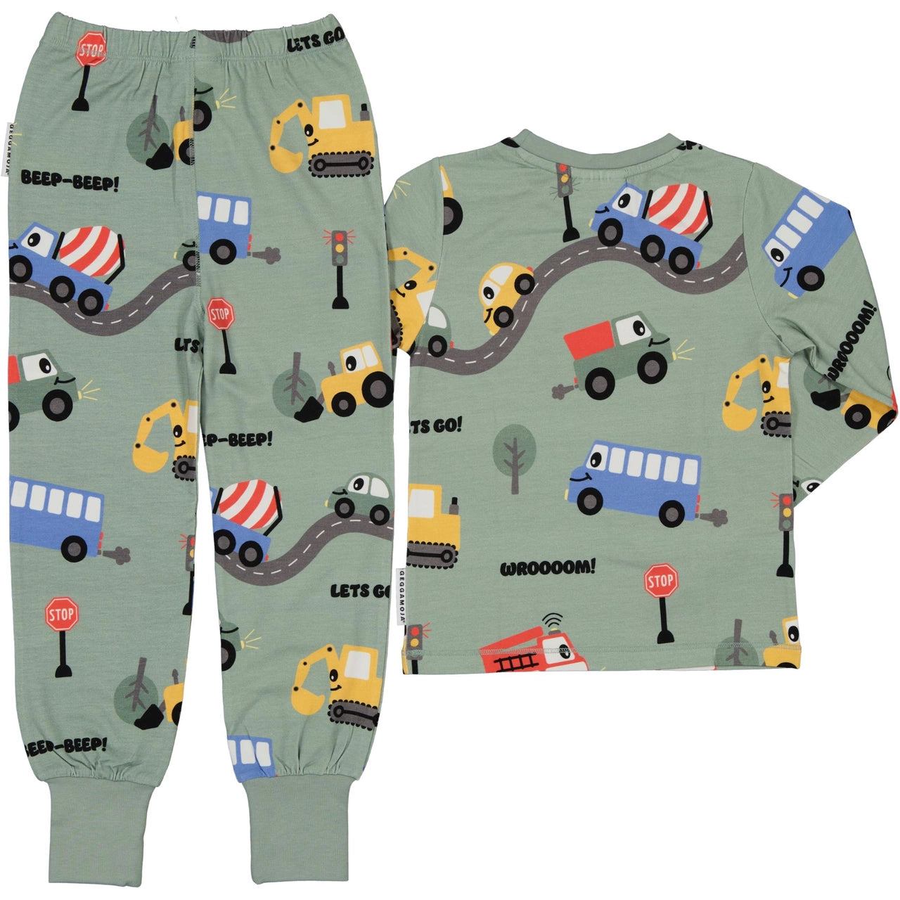 Two-piece pajamas in soft and comfortable bamboo. The pajamas consist of a pair of trousers with elastic at the waist and wide cuffs and a long-sleeved shirt also with cuffs. Bamboo is an environmentally friendly choice of material, it is grown completely organically without pesticides and is 100% biodegradable. Bamboo is smooth and comfortable against the skin and allows the skin to breathe. Its thermal properties are the same as wool and silk, making the material feel warm when it's cold and cool when it's warm - a perfect material for children's clothing.
