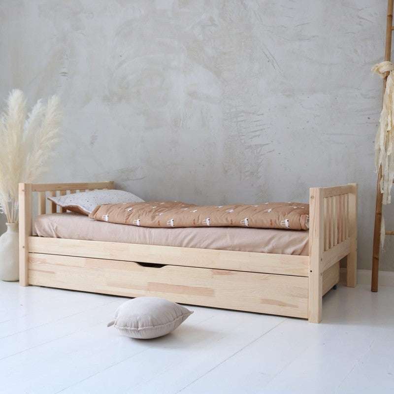 When you purchase the BASIC CLASSIC bed, you will receive a complete bed frame with a mattress base, vertical beams, and a set of railings visible in the photos. You will also receive all the elements for assembly, screws, and water-based glue (essential for gluing the bed elements together where they are joined using wooden dowels).