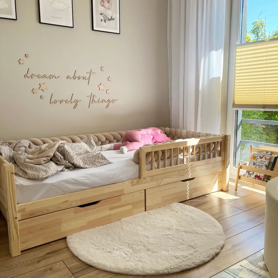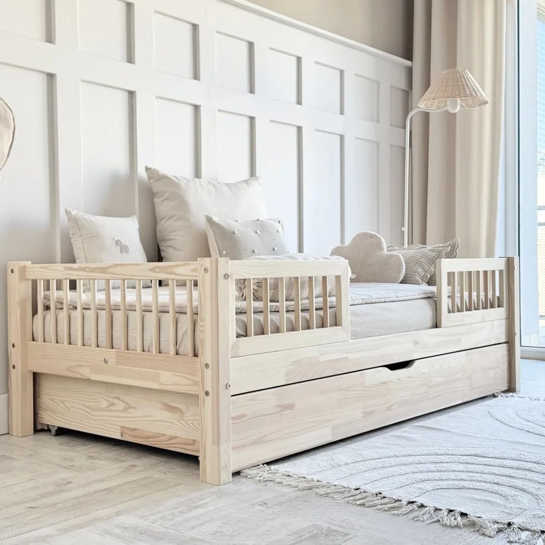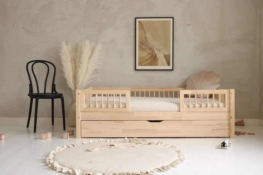 The BASIC SLATS house bed is a Scandinavian style bed. The bed is made of glue-laminated pine wood. Sanded smooth, with rounded shapes. The natural wood version is the non-treated (unprotected) wood option. The white beds are varnished with water-based, odorless and ecological paints. The water-based paint is hypoallergenic and safe for children.