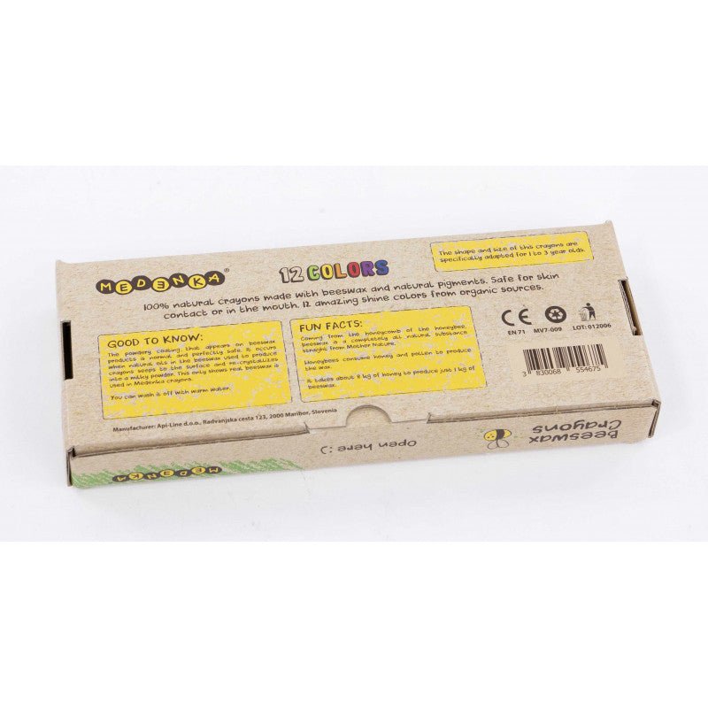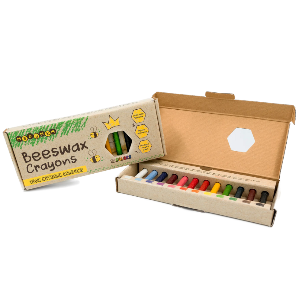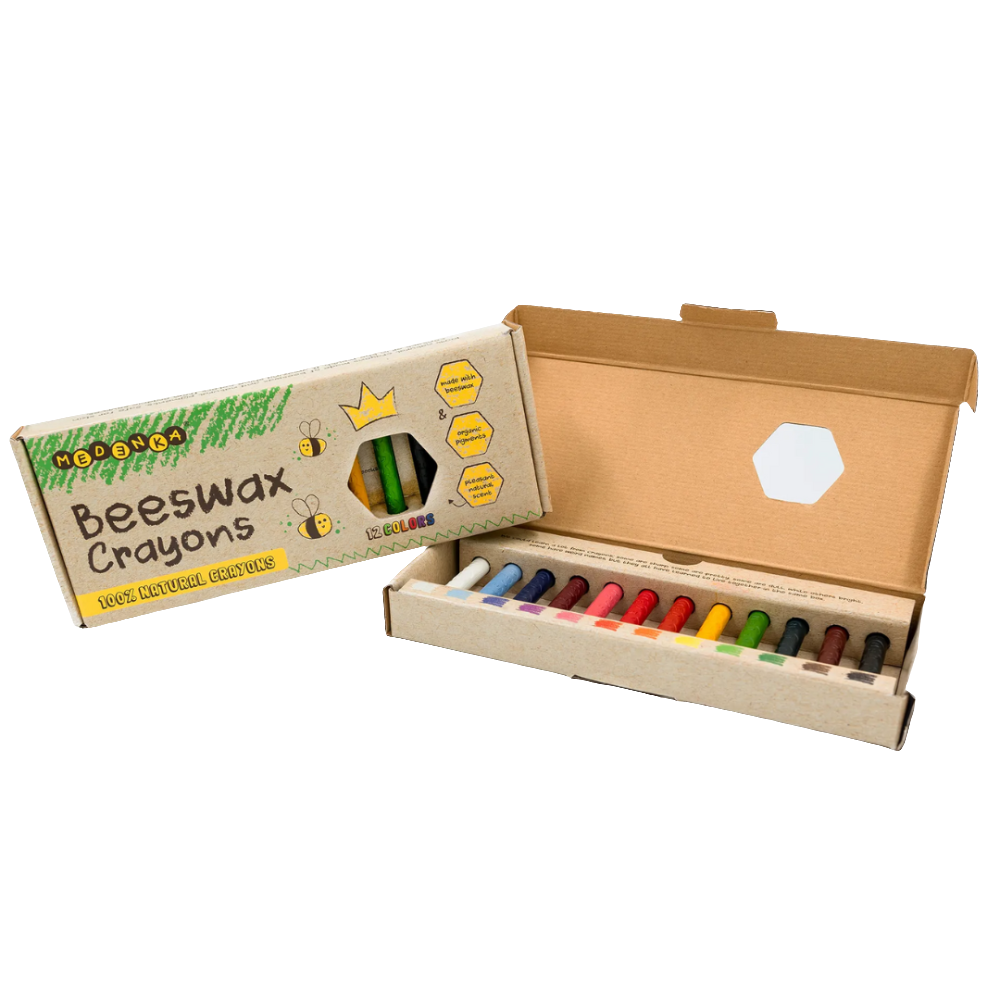 Medenka beeswax crayons are handmade with pure virgin beeswax. Produced in a traditional way free of pesticides and antibiotics, just enough plant based waxes and oils to get the perfect hardness and organic pigments make Medenka crayons safe in contact with skin or mouth. They are even safe if consumed.
