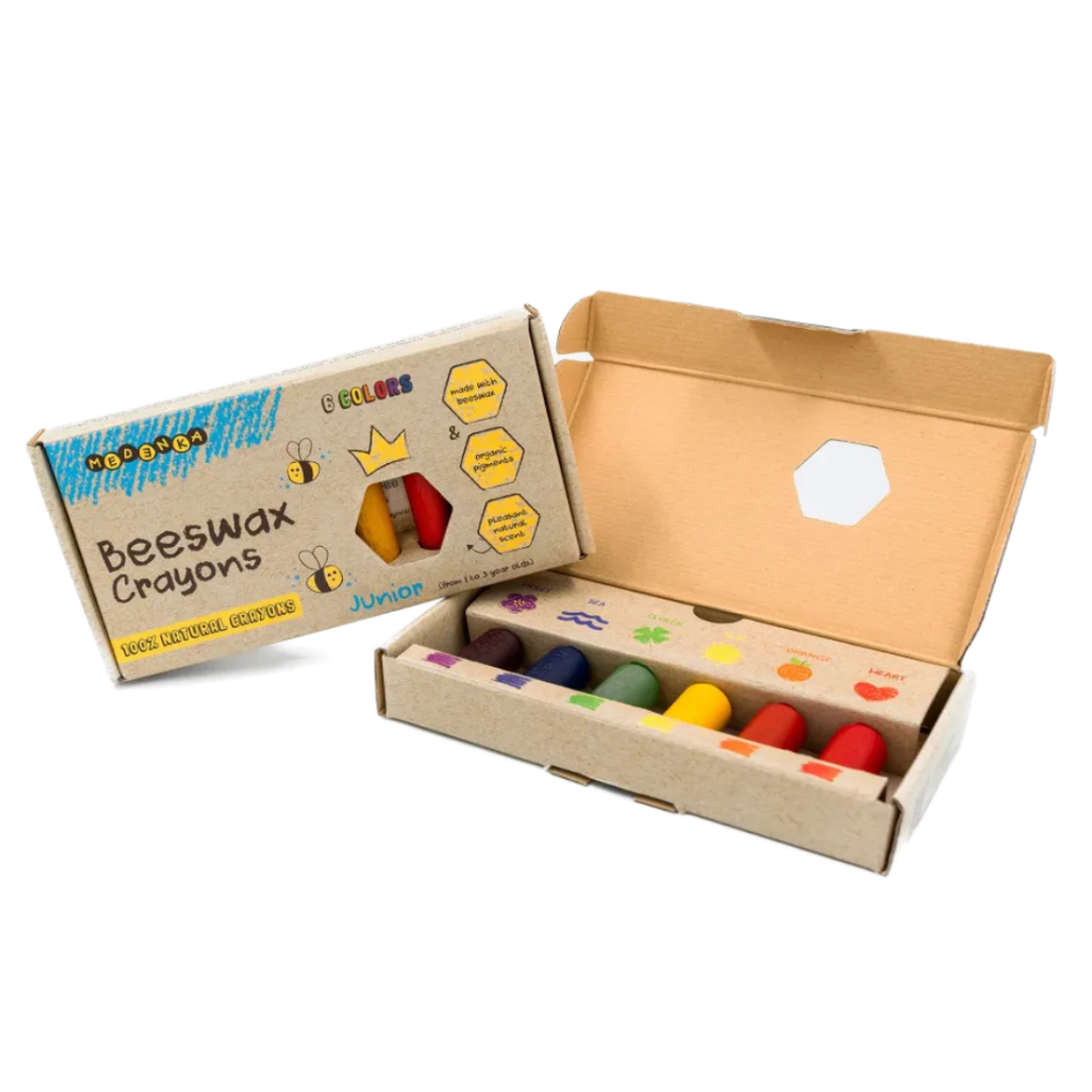 Medenka beeswax crayons are handmade with pure virgin beeswax. Produced in a traditional way free of pesticides and antibiotics, just enough plant based waxes and oils to get the perfect hardness and organic pigments make Medenka crayons safe in contact with skin or mouth. They are even safe if consumed.