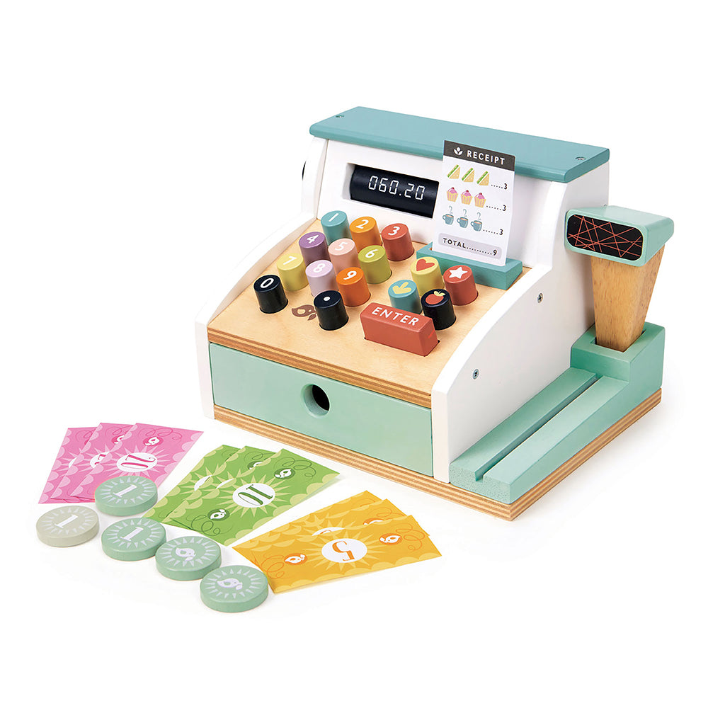 Solid wood till with paper money and wooden coins, printed receipts to insert and squishy buttons.