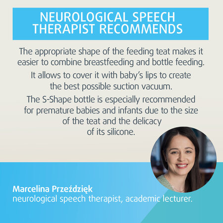 The ergonomic shape of the bottle makes feeding more comfortable for both baby and carer. When feeding with the S-Shaped Bottle, the carer intuitively adopts a natural and correct position and the baby does not need to tilt its head excessively, which is also important at the stage of independent bottle-feeding.
