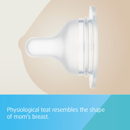 The physiological bottle teat is soft and resembles mother's breast, making it easier to combine breast and bottle feeding. Made from hypoallergenic, odourless, matt silicone – easily accepted by children. The tabs inside the dummy prevent it from collapsing and sticking together when drinking.