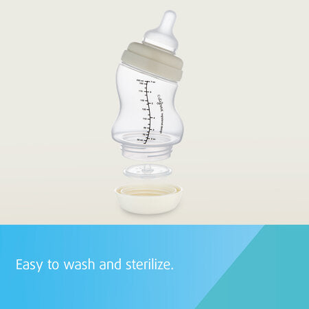 The S-Shape Bottle designed by Difrax has a unique shape and a special anti-colic mechanism. The shape of the bottle ensures that the teat is full of milk in any position, even at a slight angle (20 degrees). It supports rotational feeding, that is when the parent uses different positions throughout the day (side position, adult face, classic position), and a correct feeding position is one of the key factors in reducing the incidence of colics. The anti-colic valve and the holes in the base allow air to escape from the inside of the bottle, ensuring a constant flow of milk and allowing the baby to drink continuously without swallowing air. The combination of these two features creates a highly effective anti-colic feeding system – effectively eliminating air from the bottle and teat and reducing the risk of colics, cramps and other abdominal discomfort.