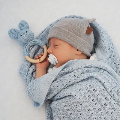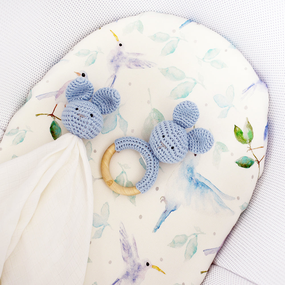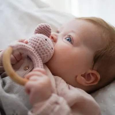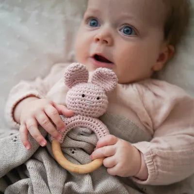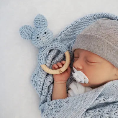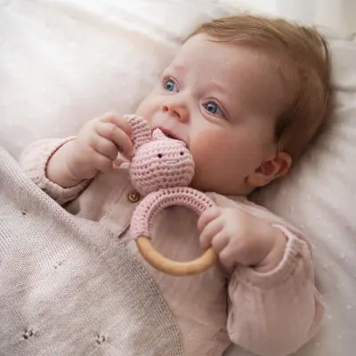 Eco rattle teether for babies. Hand knitted, pleasingly rattling toy with maple wood ring impregnated with organic coconut oil. A truly exceptional and beautiful gift for a teething baby.