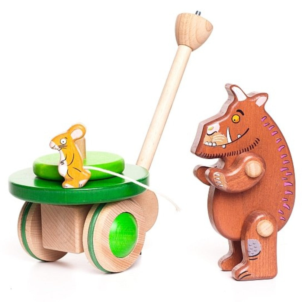 This push along Gruffalo toy has a natural wooden handle and wheels with a grassy green base for the two characters. Take it for a stroll and watch the gruffalo and mouse interact. The wheels are stable and have non-slip rims - ideal for new walkers. This classic toy will be a hit with children and parents alike, and is a great way to encourage toddlers to walk.