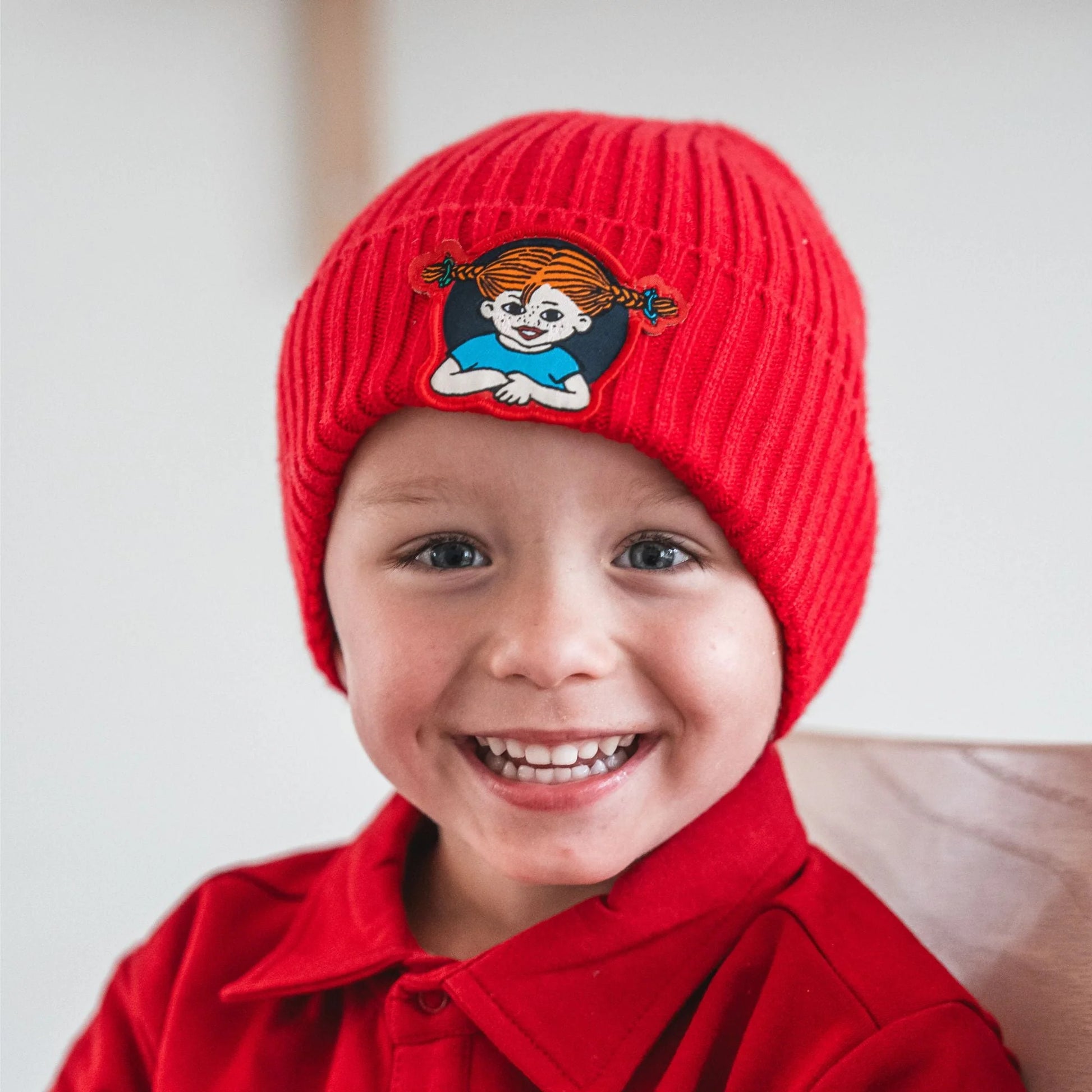 Knitted hat from Geggamoja with embroidered Pippi logo on the front.