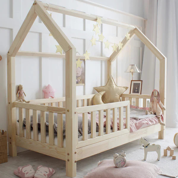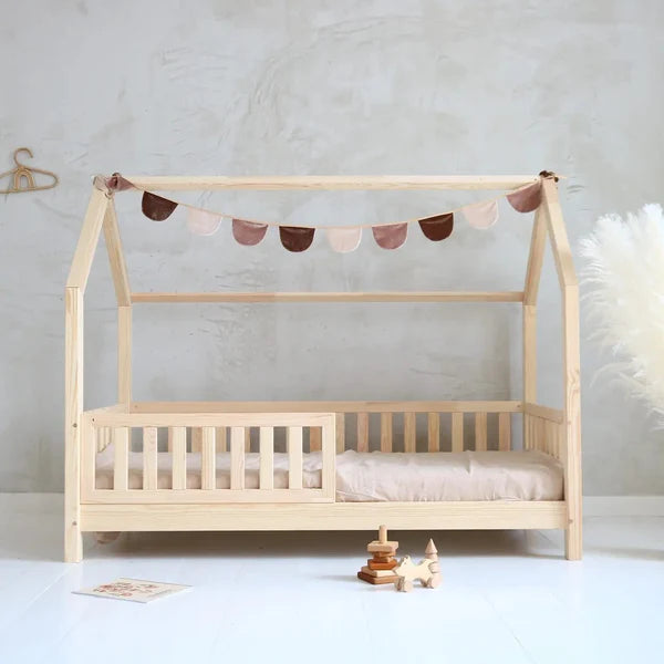 Buying the BIANCO you get a complete bed frame with a base for a mattress, vertical beams, a mini-roof and the set of rails presented in the photos.