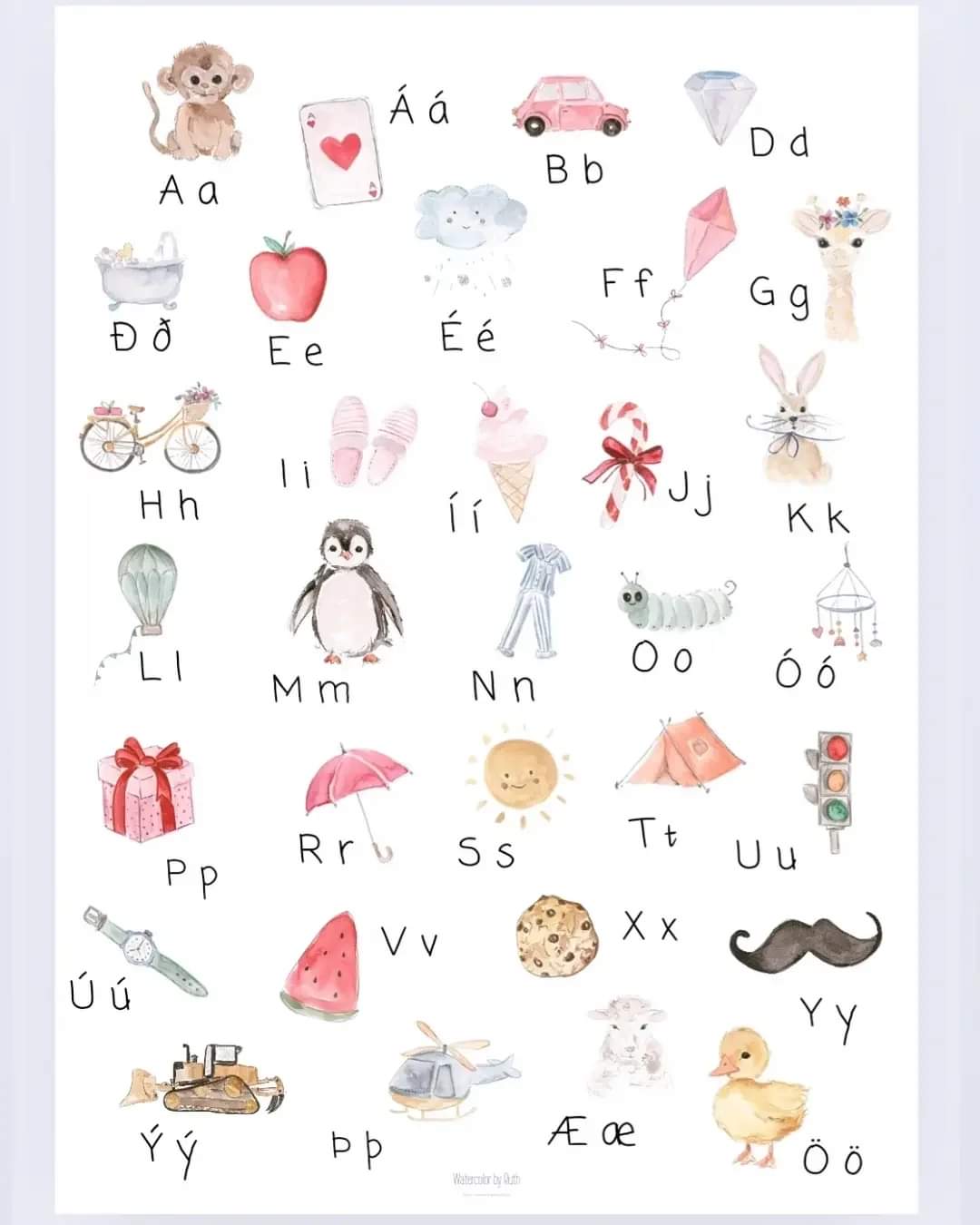 Ævintýralegar vatnslitamyndir eftir Ruth sem prýða nýjasta stafrófsplakatið.
