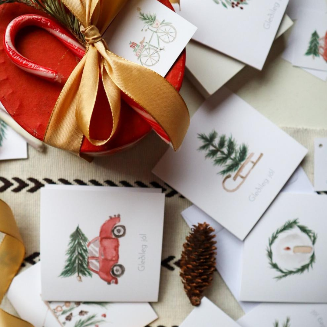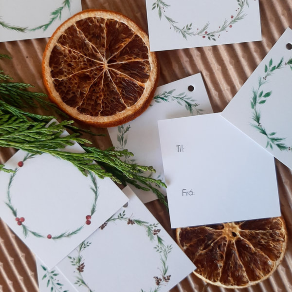 Stærð á jólamerkimiðum 5x5 cm með textanum Til; Frá; á bakhlið.