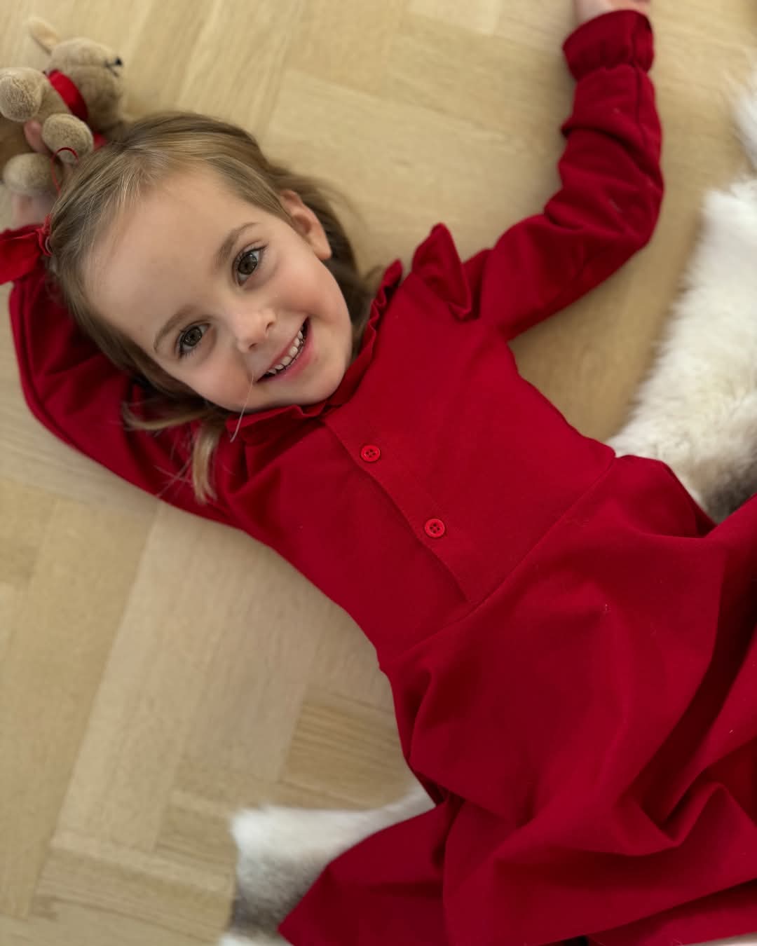 Dress with flouence at neck, shoulders and cuffs. The dress is made of organic cotton. It has a slightly flared skirt and buttoning at the back.