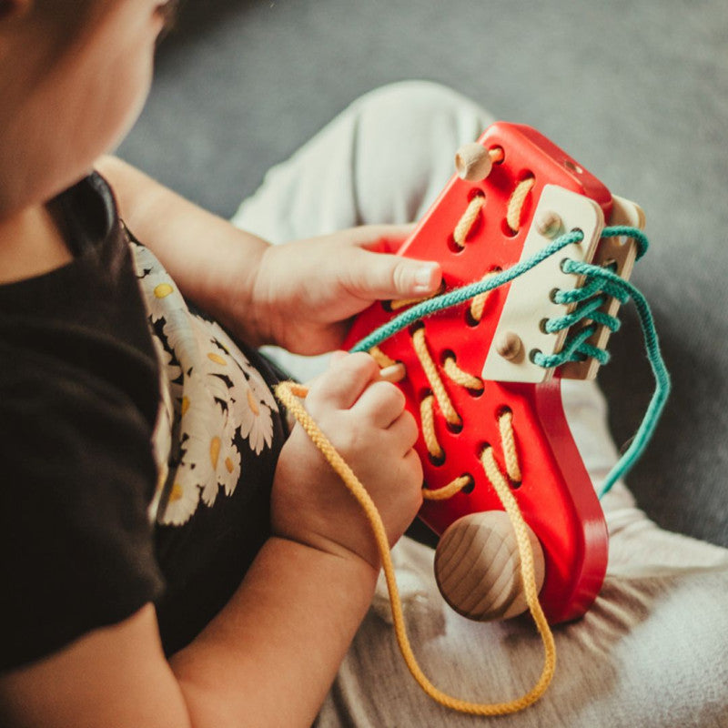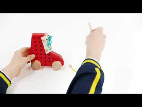 It is a hard task to tie the knot properly, and the shoelaces are usually very long. How to learn the shoe lacing technique? To learn that skill requires a lot of practice. That is why lacing toys were created. This one is special, because it is a shoe. On the upper it has a lot of holes, and pulling the string through them is a beginners lesson to shoe lacing. The more advanced learners can try their hand at lacing the instep. When you finally tie that perfect knot, you will be rewarded for all the trials. This shoe is also a vehicle, it has wheels so you can pull it along. Playing with this toy helps develop gross and fine motor skills as well as hand-eye coordination.