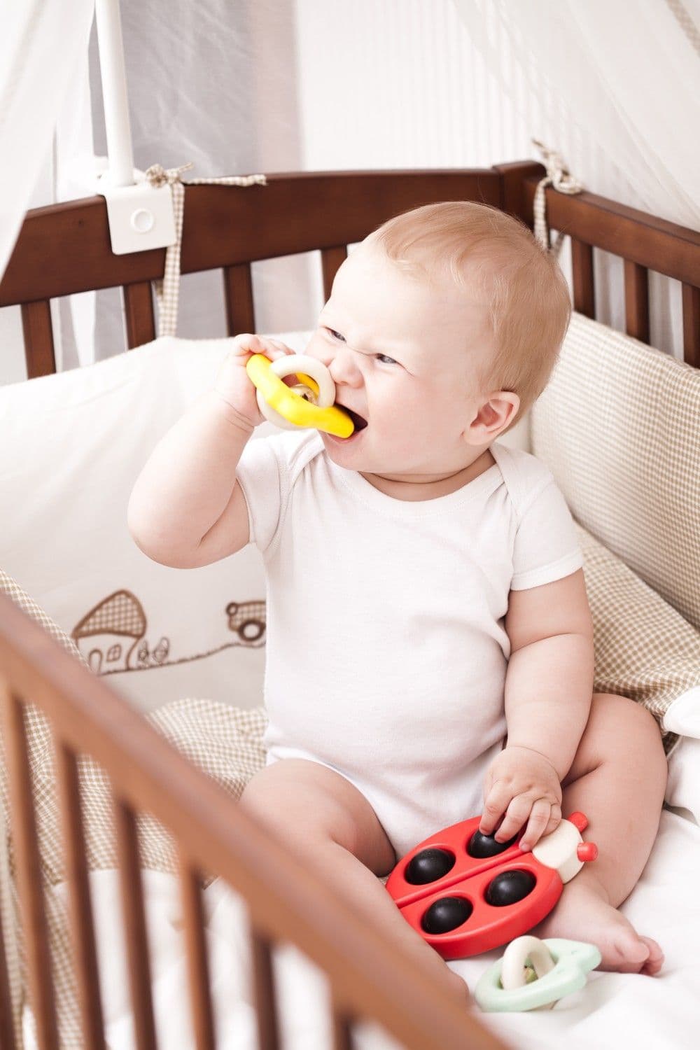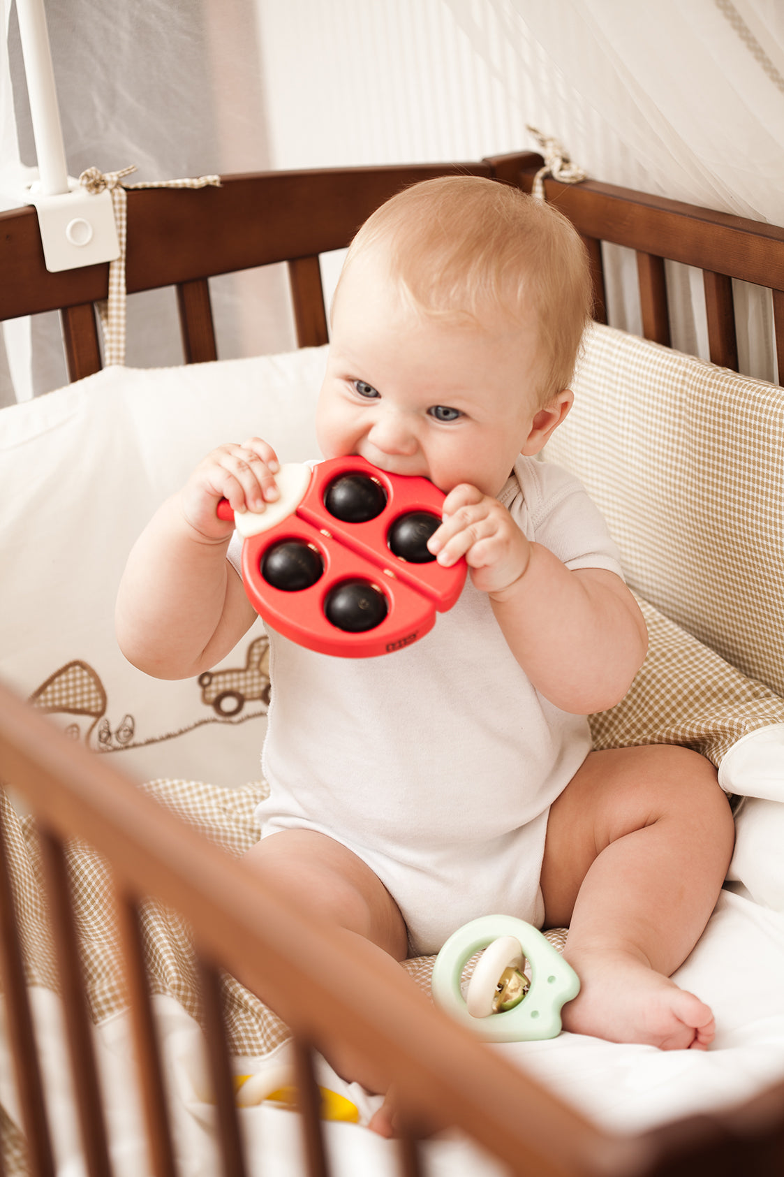 High quality toy. The bright red of the wooden ladybird will attract attention of older babies. The rolling black dots on the ladybird allow her to glide on any surface, they are great fun for little ones to spin too.