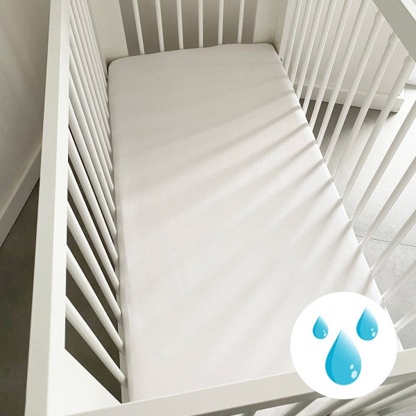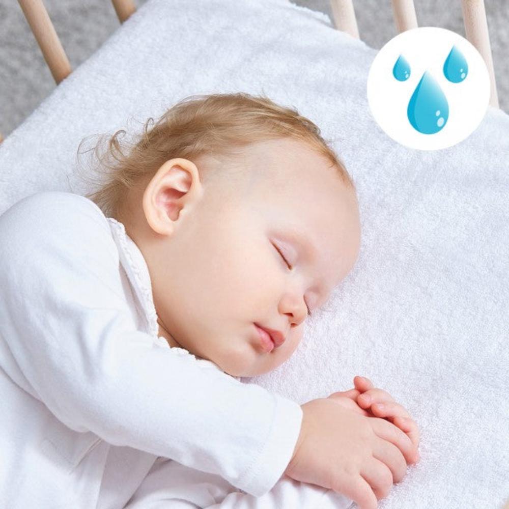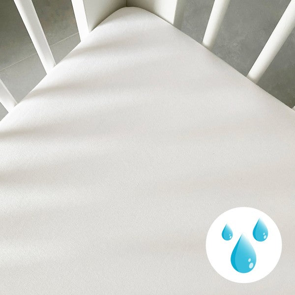 Made of cotton terry cloth, with a waterproof, breathable membrane on the bottom. The sewn-in elastic band prevents the sheet from sliding off the mattress.