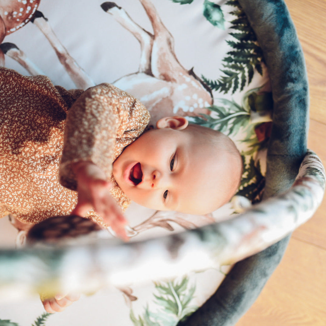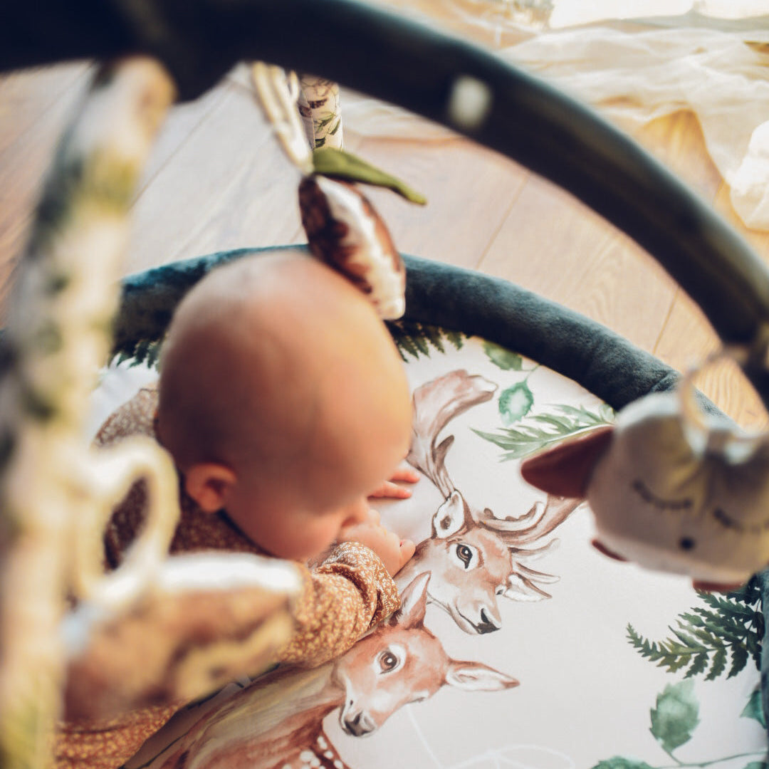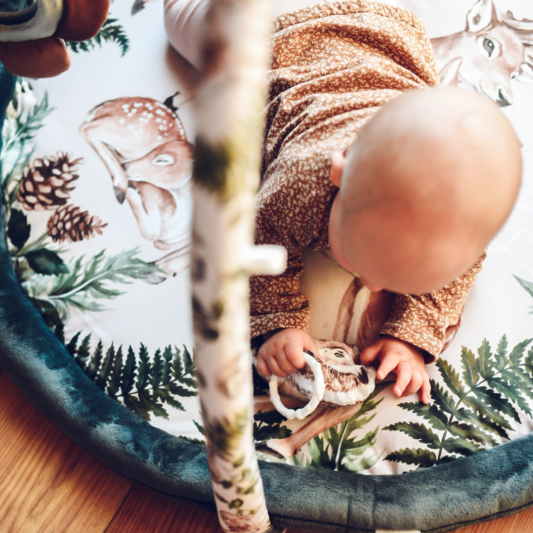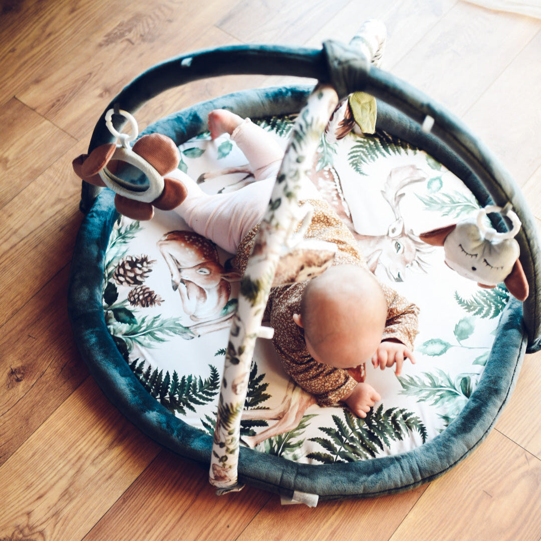 Beautiful and super soft educational playmat with a set of sensory toys of various shapes. It is possible to remove the frame and use just the mat on its own.