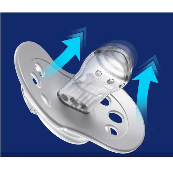 LOVI Silicone Dynamic Soother® designed with the help of neurologopedists. Unique design glowing in the dark: made of non-homogeneous silicone layer, which enables shrinking and expanding with the baby’s suckling motions; symmetrical shape of the teat is based on the nipple’s structure. Does not disturb the suckling reflex and natural development of speech and bite patterns. Its contoured shape enables the child to breathe easily through the nose; safe materials do not include bisphenol A. Enables free flow of air and prevents the baby skin from irritating.