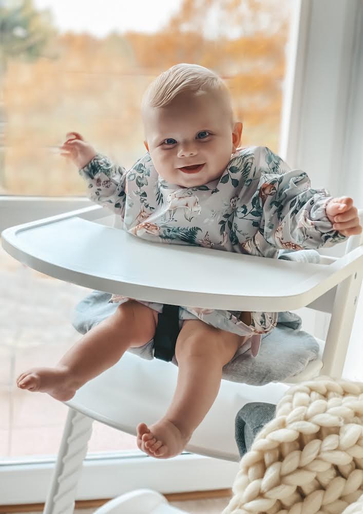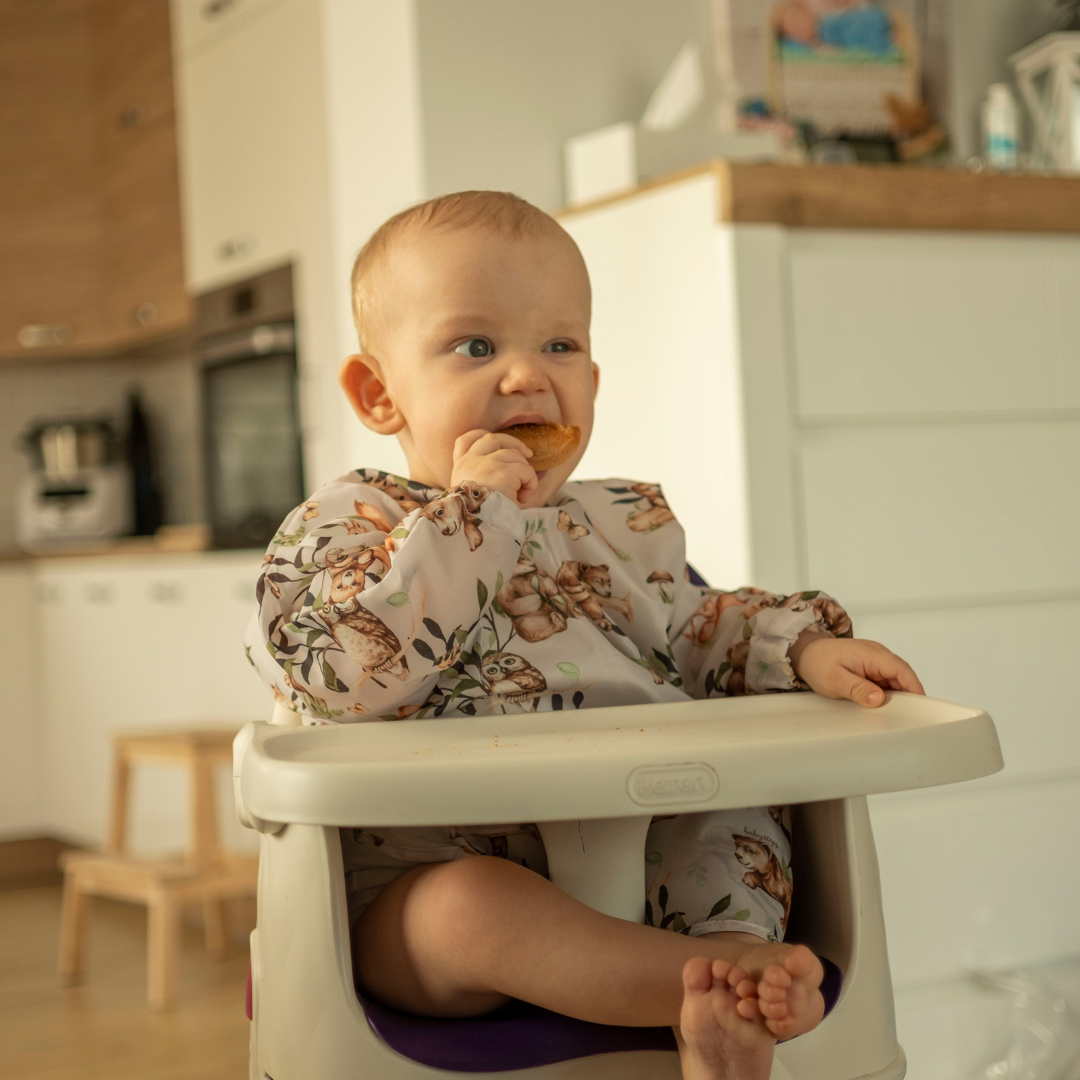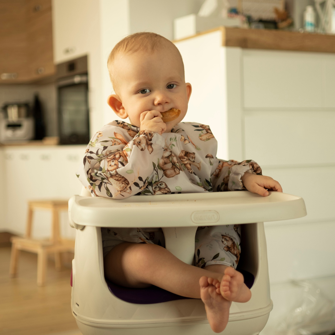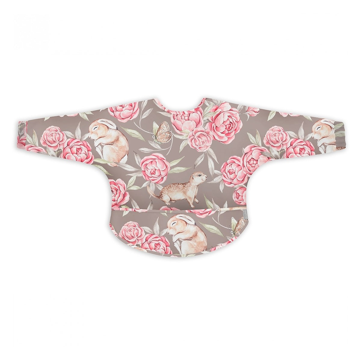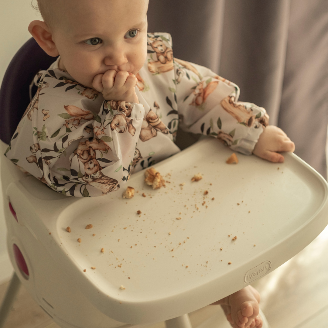 Waterproof bib made with soft, lightweight, water-repellent fabric from 100% recycled polyester. Practical, perfect for eating, with a pocket at the bottom to catch any dropped food from your little ones hands.