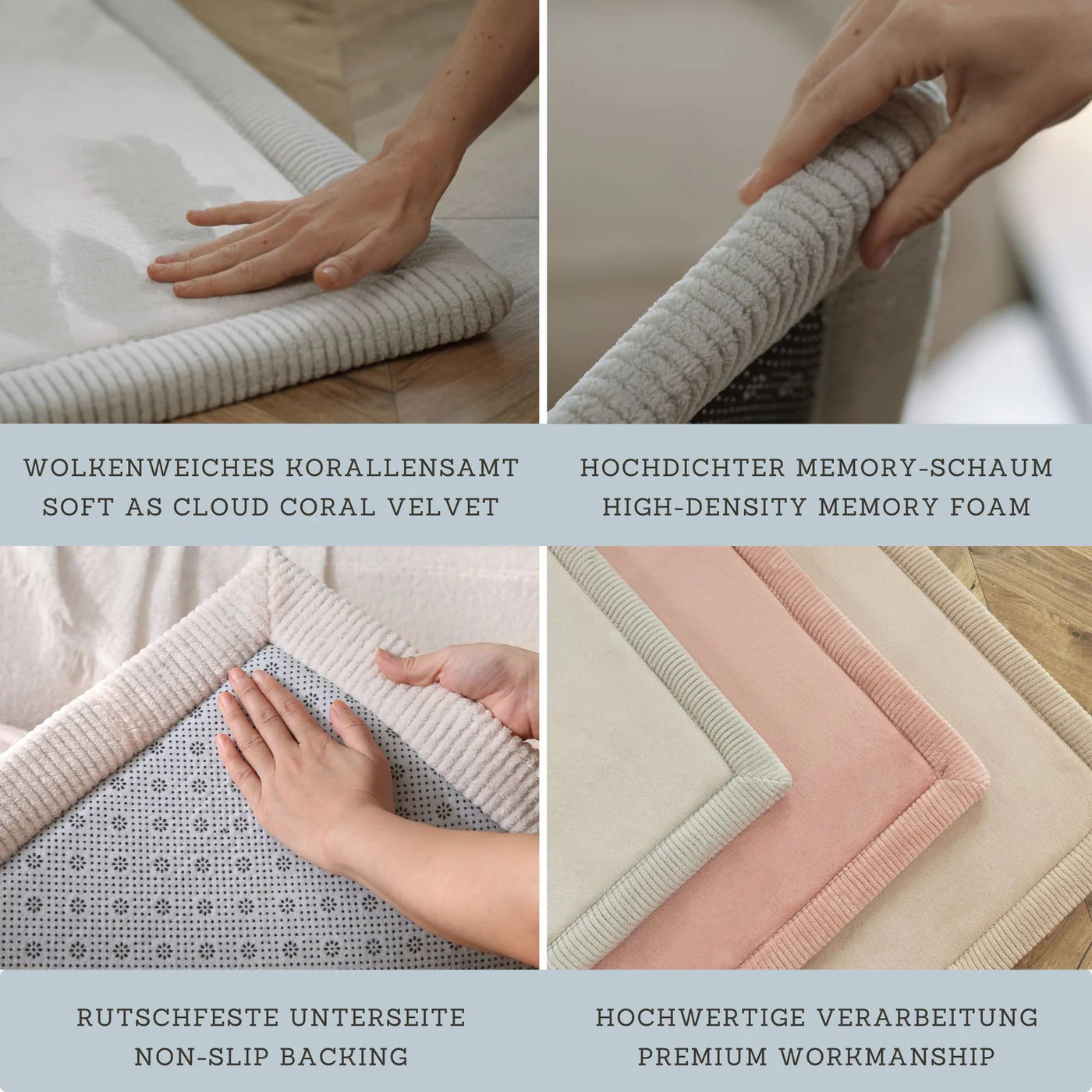 The cloud-soft play rug for children consists of three layers: 1. coral velvet for the softest skin contact, 2. elastic memory foam for comfortable playing and crawling, 3. non-slip backing to protect against shocks when falling.