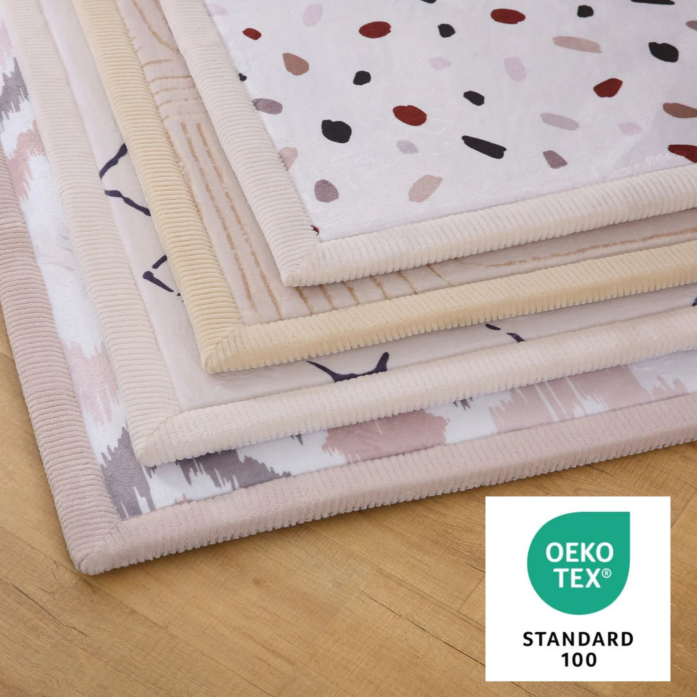 The cloud-soft play rug for children consists of three layers: 1. coral velvet for the softest skin contact, 2. elastic memory foam for comfortable playing and crawling, 3. non-slip backing to protect against shocks when falling.