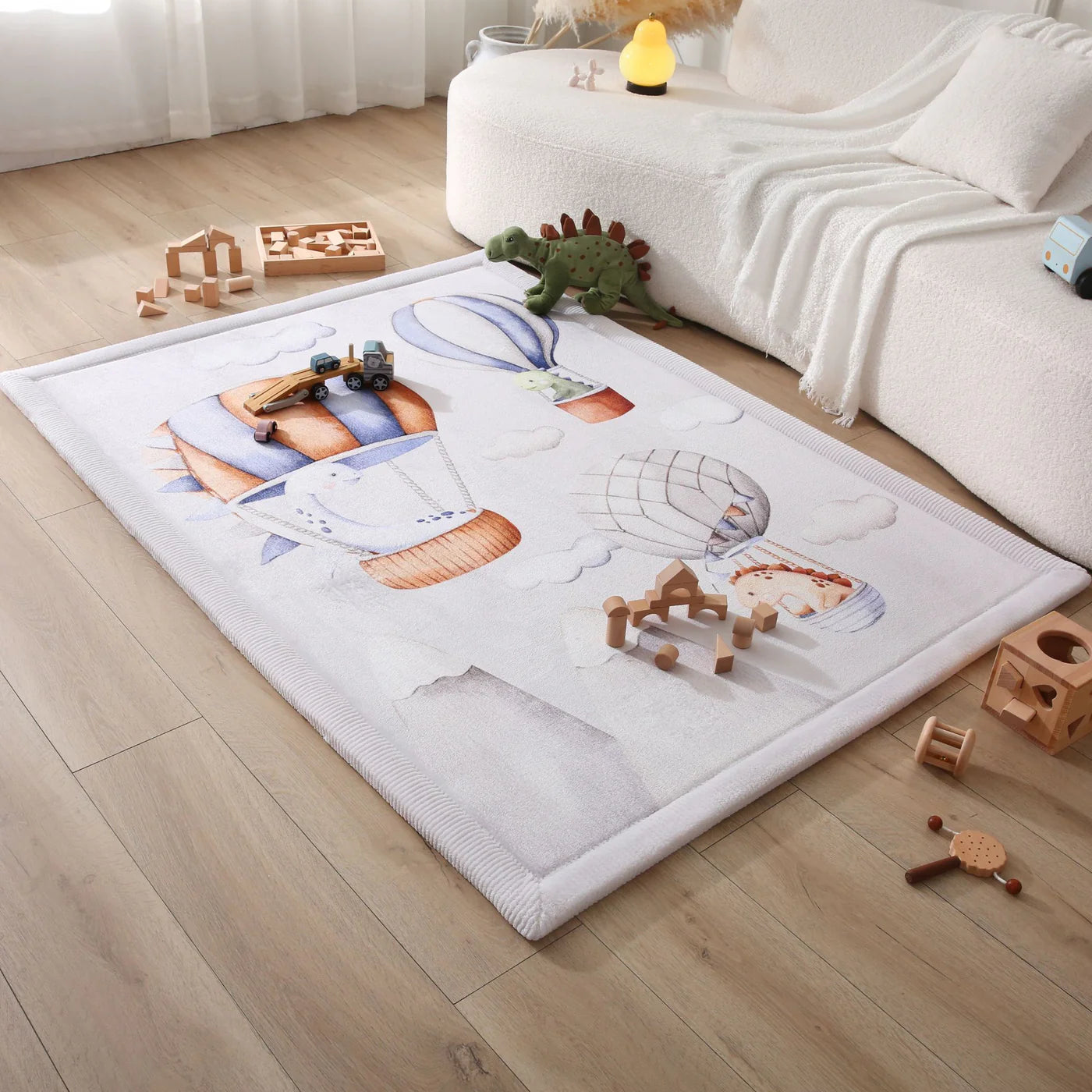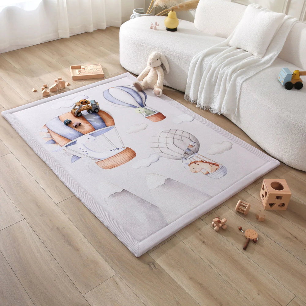 The cloud-soft play rug for children consists of three layers: 1. coral velvet for the softest skin contact, 2. elastic memory foam for comfortable playing and crawling, 3. non-slip backing to protect against shocks when falling.