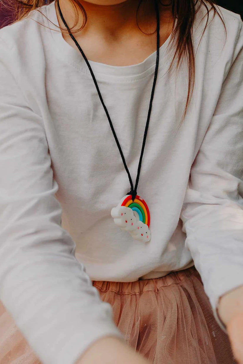 Our Rainbow Necklace features a BPA-free, 100% non-toxic food-grade silicone pendant to withstand the most strenuous of chews, on a black necklace featuring our custom-designed safety clasp that separates easily when gently tugged.