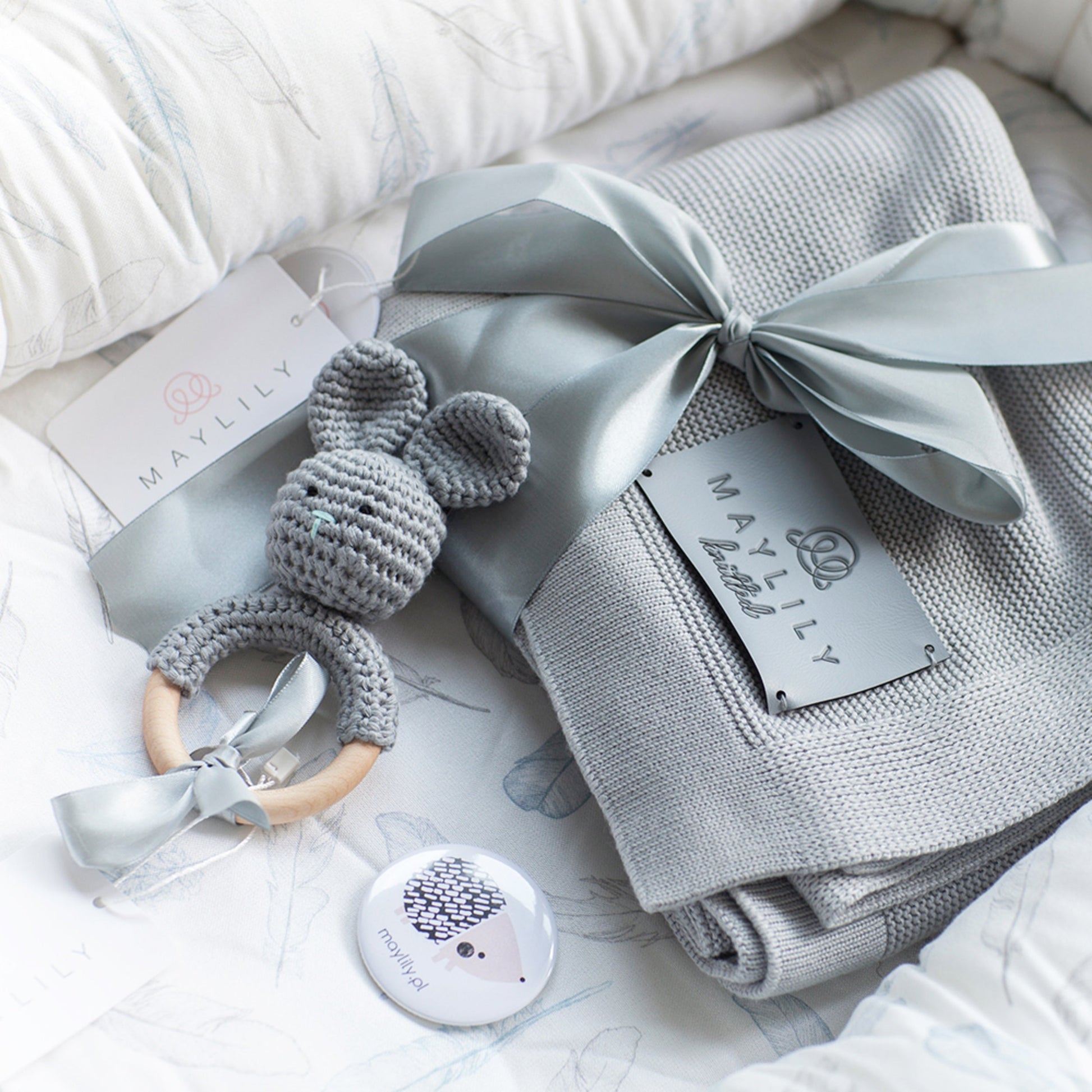 Eco rattle teether for babies. Hand knitted, pleasingly rattling toy with maple wood ring impregnated with organic coconut oil. A truly exceptional and beautiful gift for a teething baby.