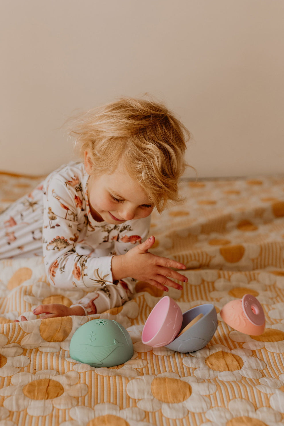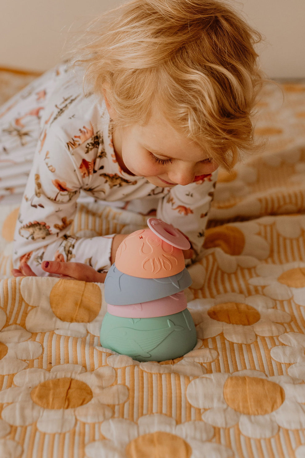 A set of 5 Stacking Cups plus 5 Treasure Coins! Our Ocean Stacking Cups to help your kids explore marine life through sensory play. Stack them up, nest them, hide objects under, texture stamp with sand or playdough...and match the coins with their cup!