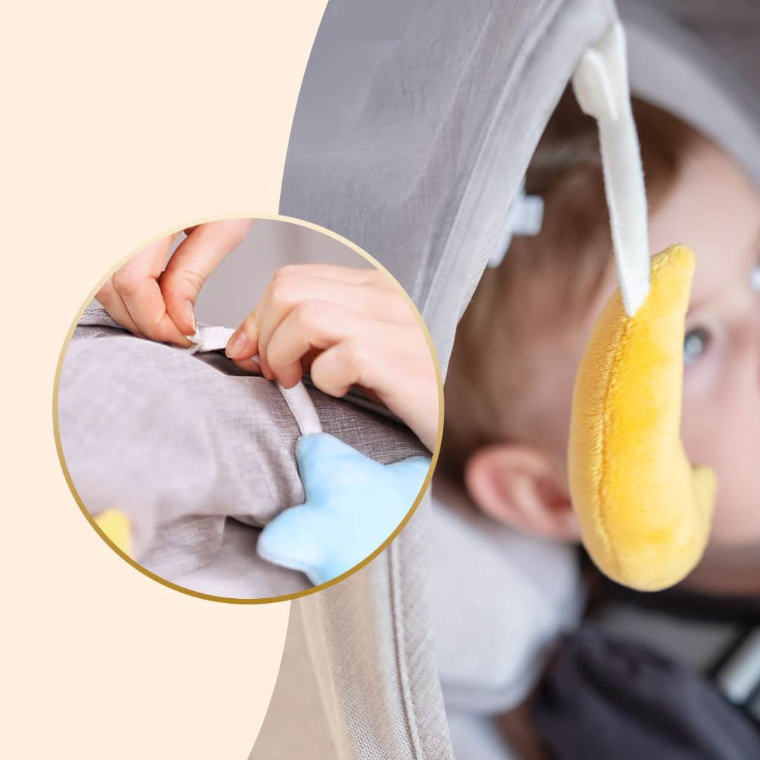 The plush, detachable star and moon-shaped pendants are not only an aesthetic addition. The toys in contrasting colours stimulate the senses, which has a positive effect on the development of children’s perception.