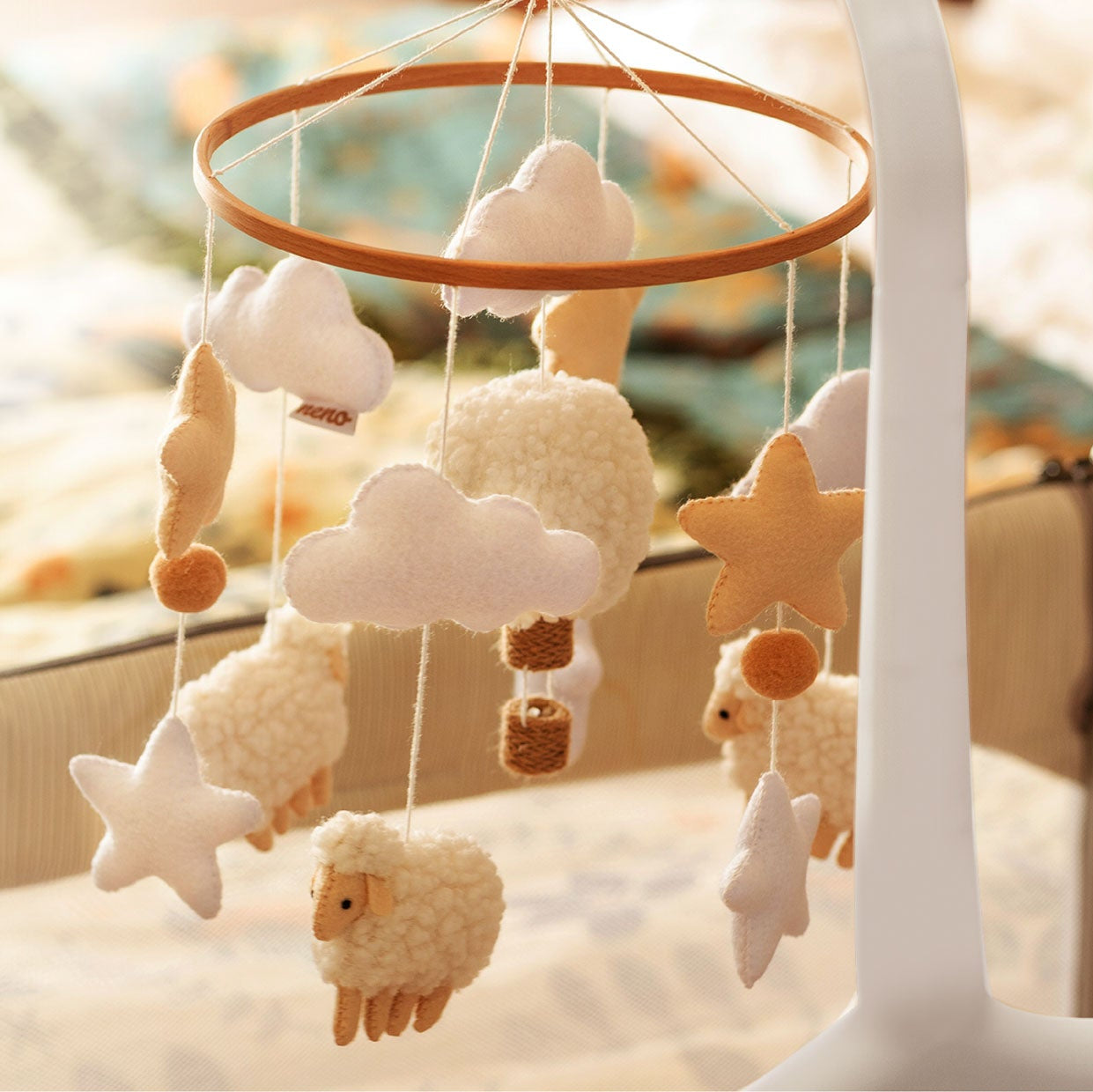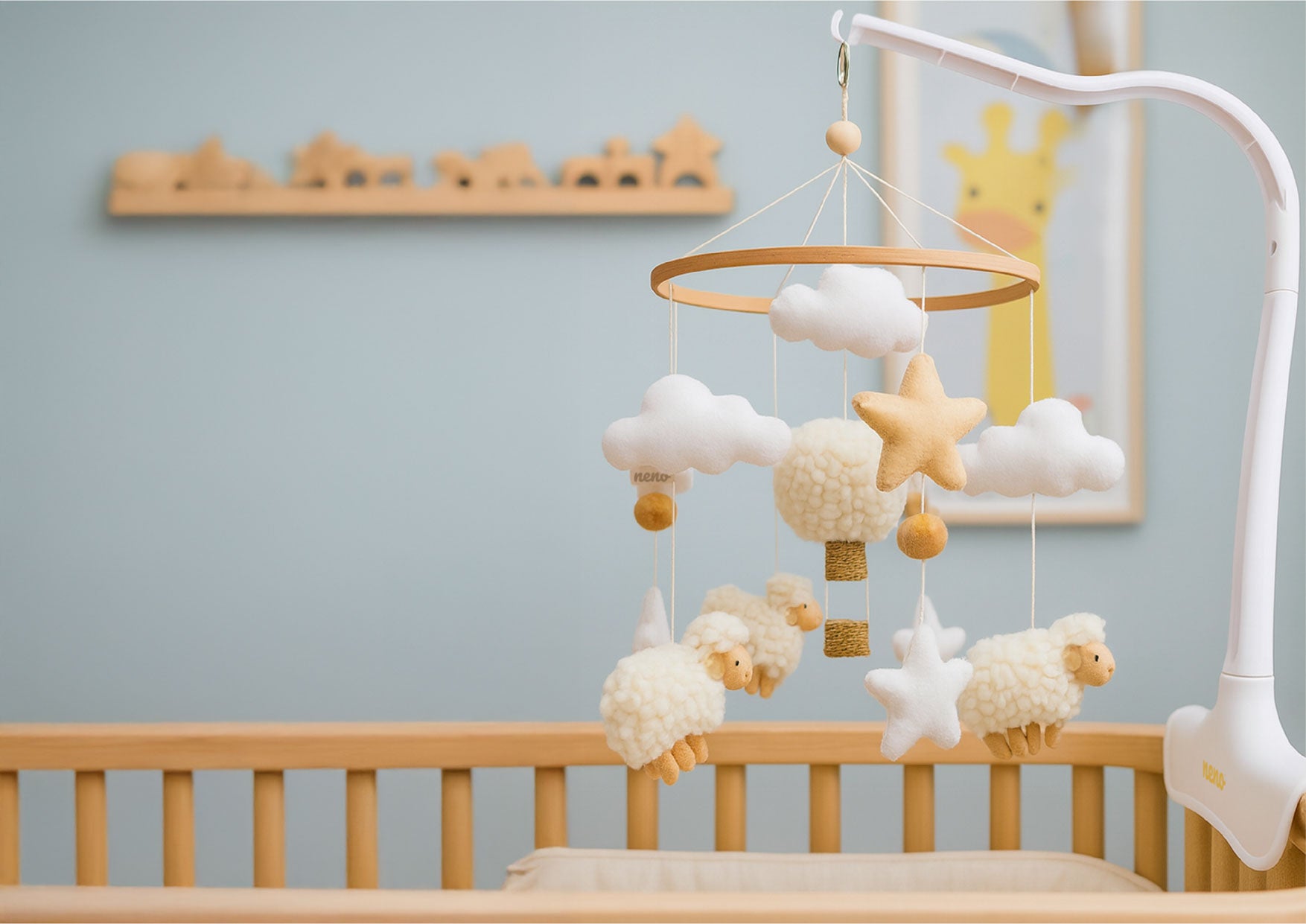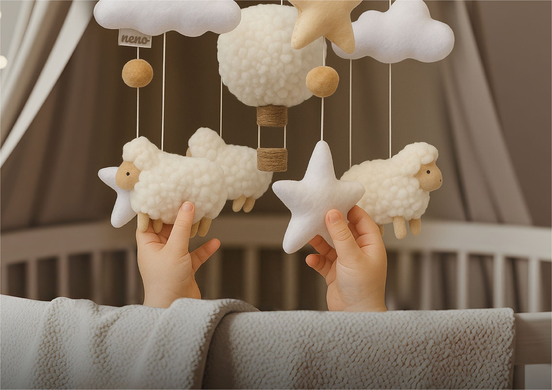 The Neno Nelu carousel combines modern design with functionality to support baby's sensory and motor development. The handmade pastel-coloured mascots soothe and encourage play. Easy to assemble and sturdy, it is perfect for any children's room.