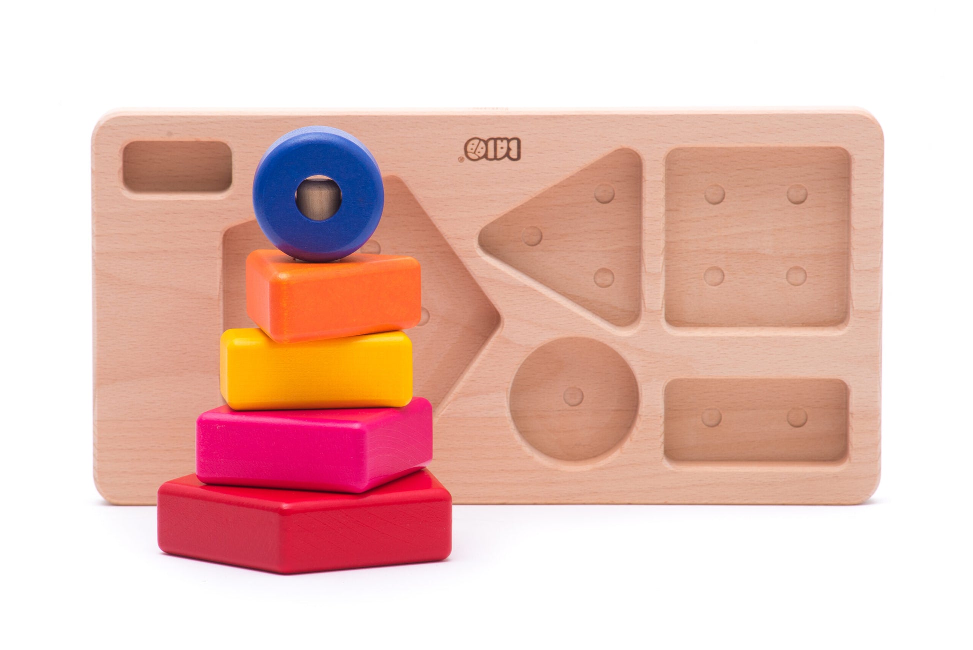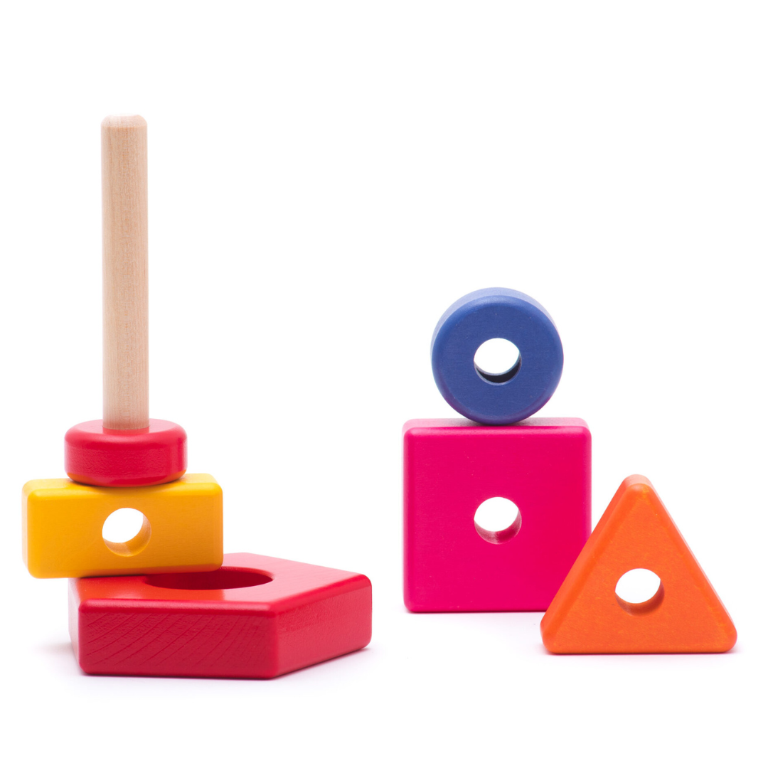 This wooden shape sorter is a fun stacking toy that will keep toddlers busy as they slot the five brightly coloured shapes into this sorting block or stack the circle, square, triangle, pentagon and rectangle on the column. Toddlers will enjoy taking the five coloured shapes out from the solid board, placing them onto the column and putting them back when done, developing their dexterity as they play.