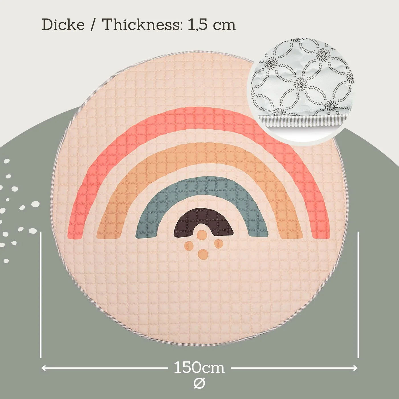 LARGE AND SOFT - The foldable play mat with a generous 150 cm diameter and 1.5 cm thickness offers plenty of space for crawling and playing, for yoga and sports exercises or outdoor picnics. The children's play mat is easy to clean and suitable for machine washing at 30°C.