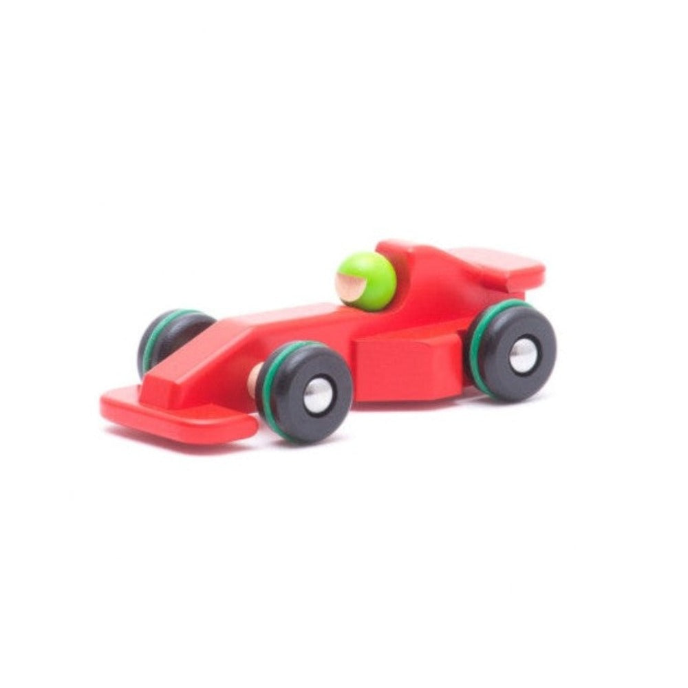 The wheels of the racing car are not painted. The Bajo company makes sure that every toy has a wooden element without any coat of paint in order for children to get to know, see and feel the structure of wood.