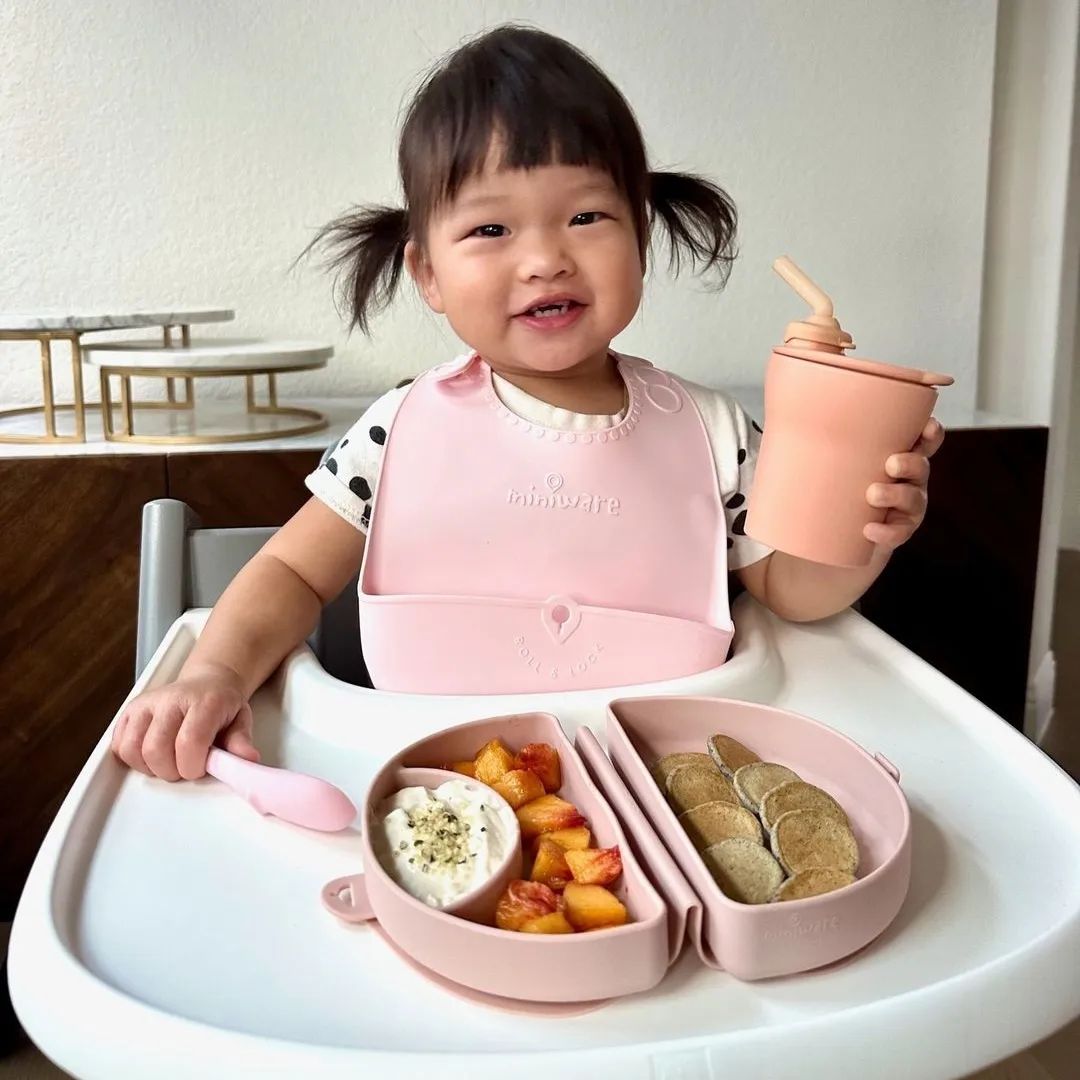 This set includes: 2x silicone bibs (1x gray and 1x candy pink)
