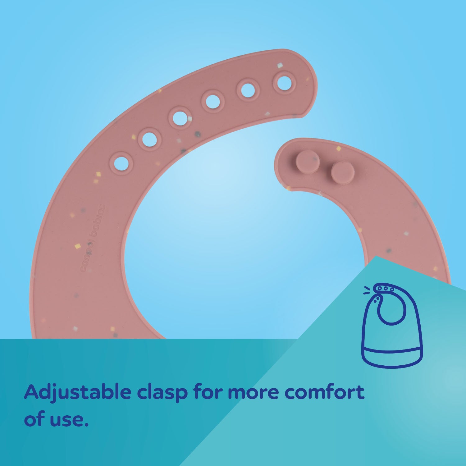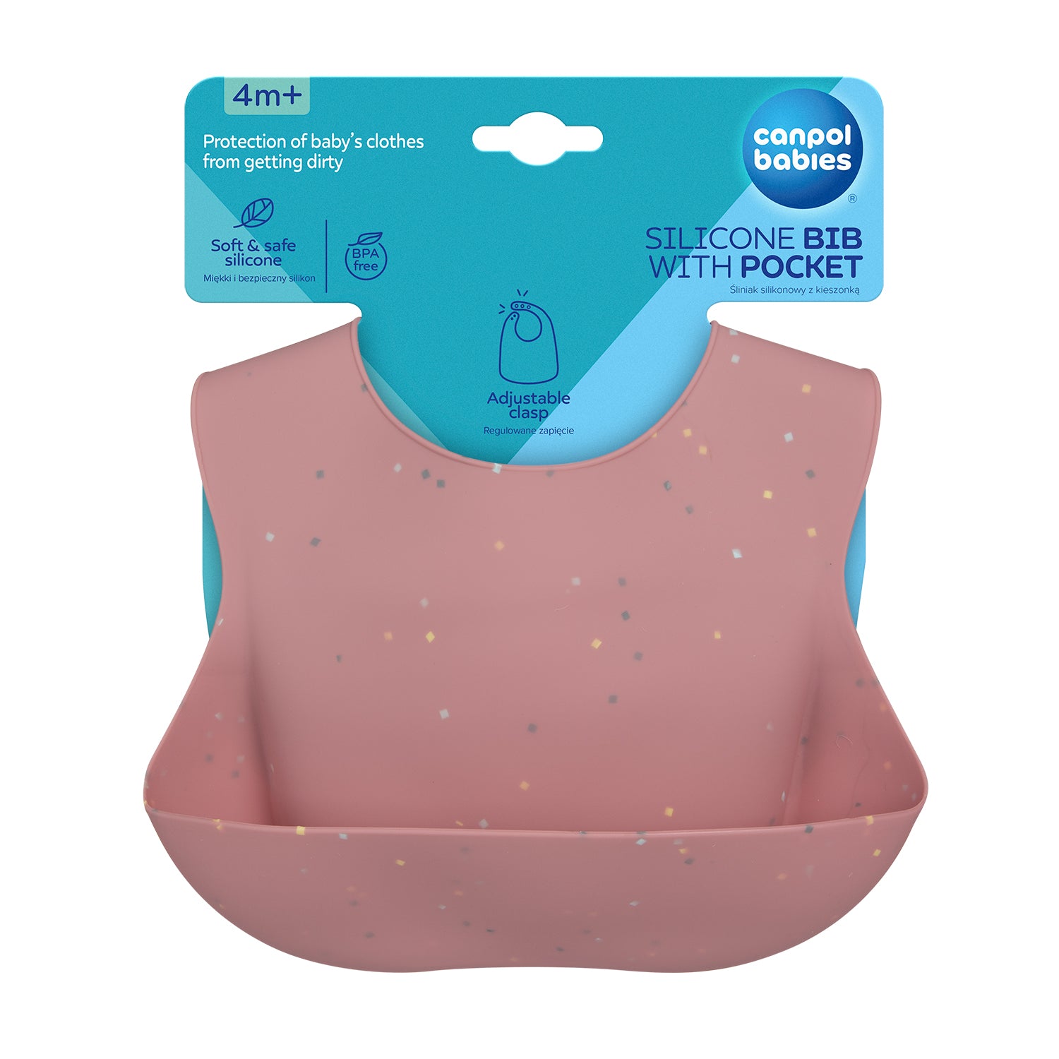 Canpol bib with a pocket has a convenient, adjustable clasp, so you can easily adjust the size to your child's neck.