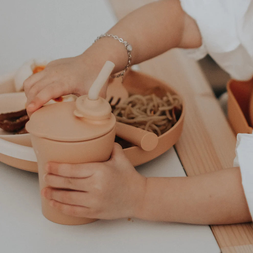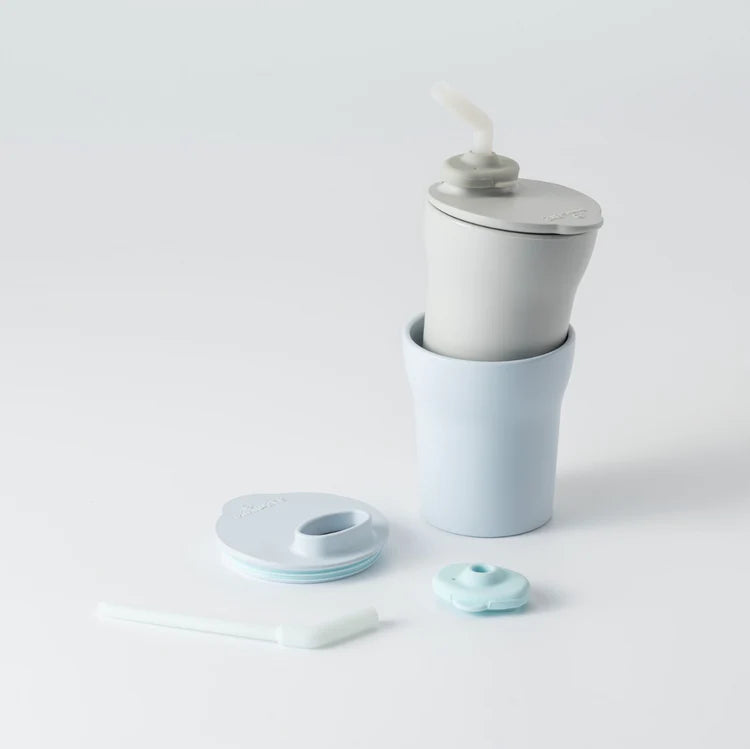 Goes from silicone straw to non-drip lid with spout, to a real cup. The non-drip lid has a spout perfectly sized for little mouths. Earth and family safe materials, biodegradable and food grade. Dishwasher safe and easy to clean.