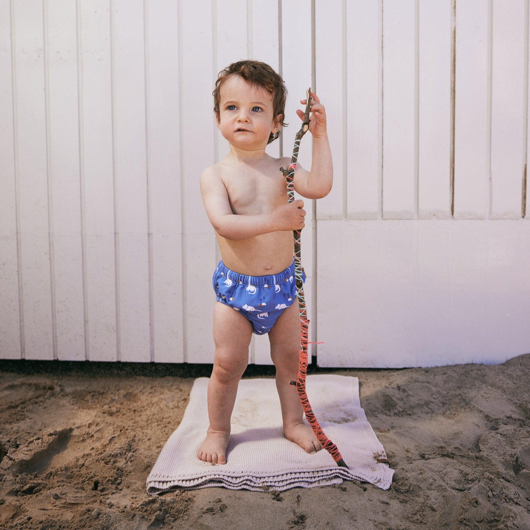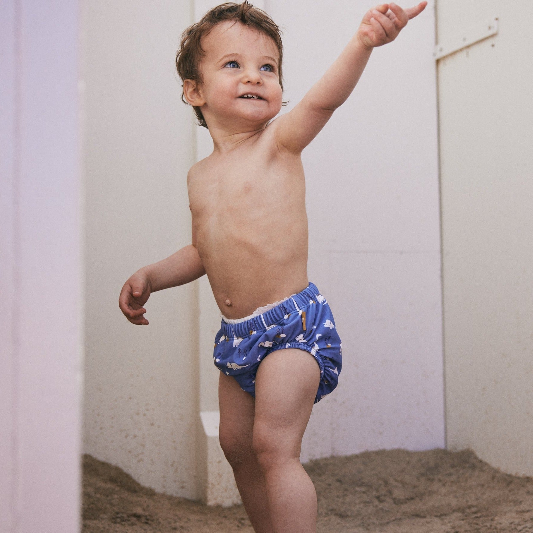 Practical fabric swim diaper with cute pattern, keeps your baby comfortable but also provides protection against harmful UV rays.