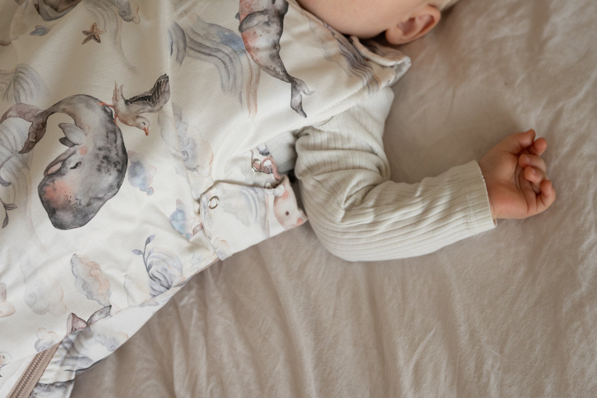 ONE SIZE 2in1 - Það er hægt að stækka svefnpokann með einföldum hætti úr 0-6 mánaða í 6-12 mánaða með því að losa smellur við fætur og hendur.
