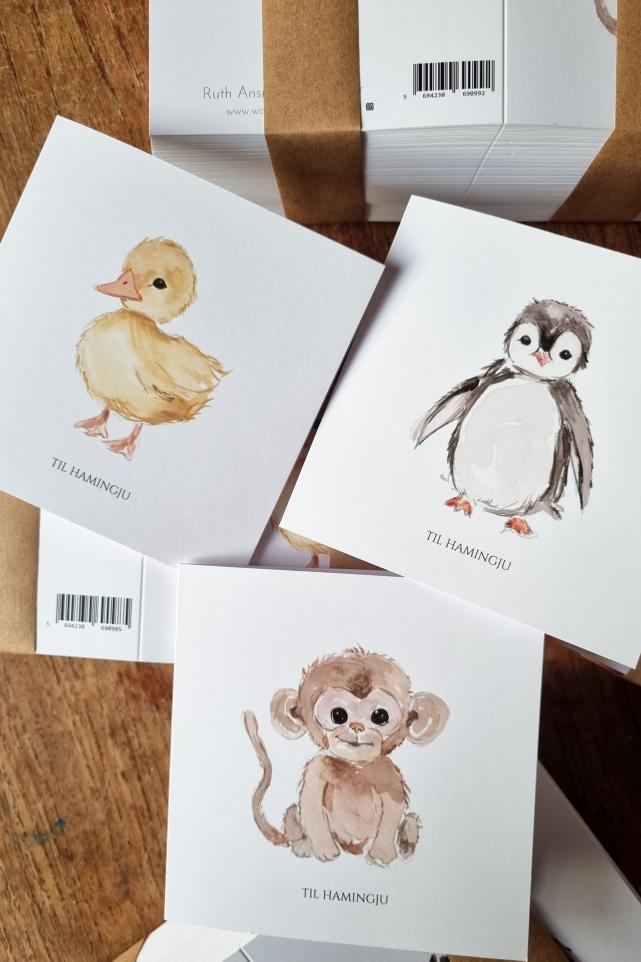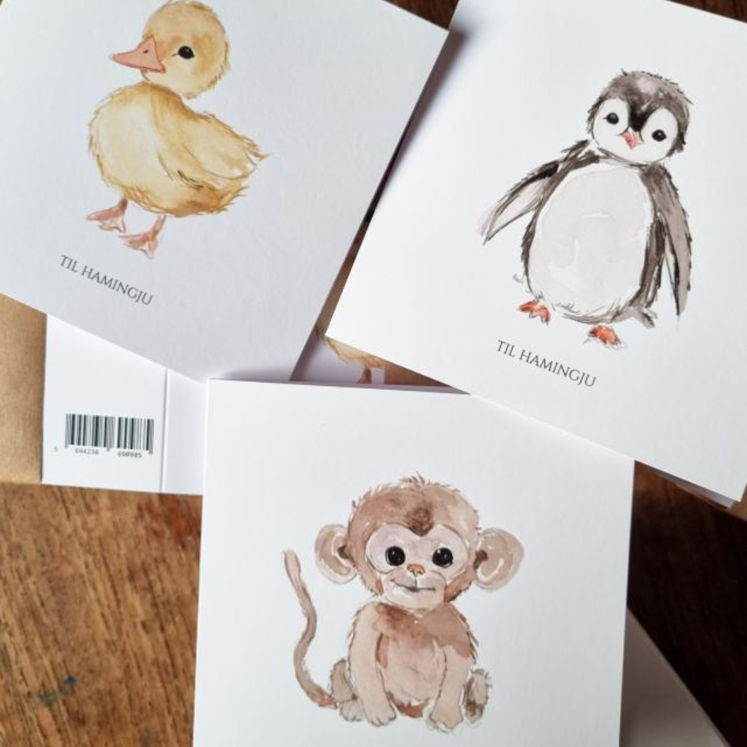 Ný Til hamingju! krúttkort fyrir þau allra minnstu með vantslitamyndum úr stafrófinu.