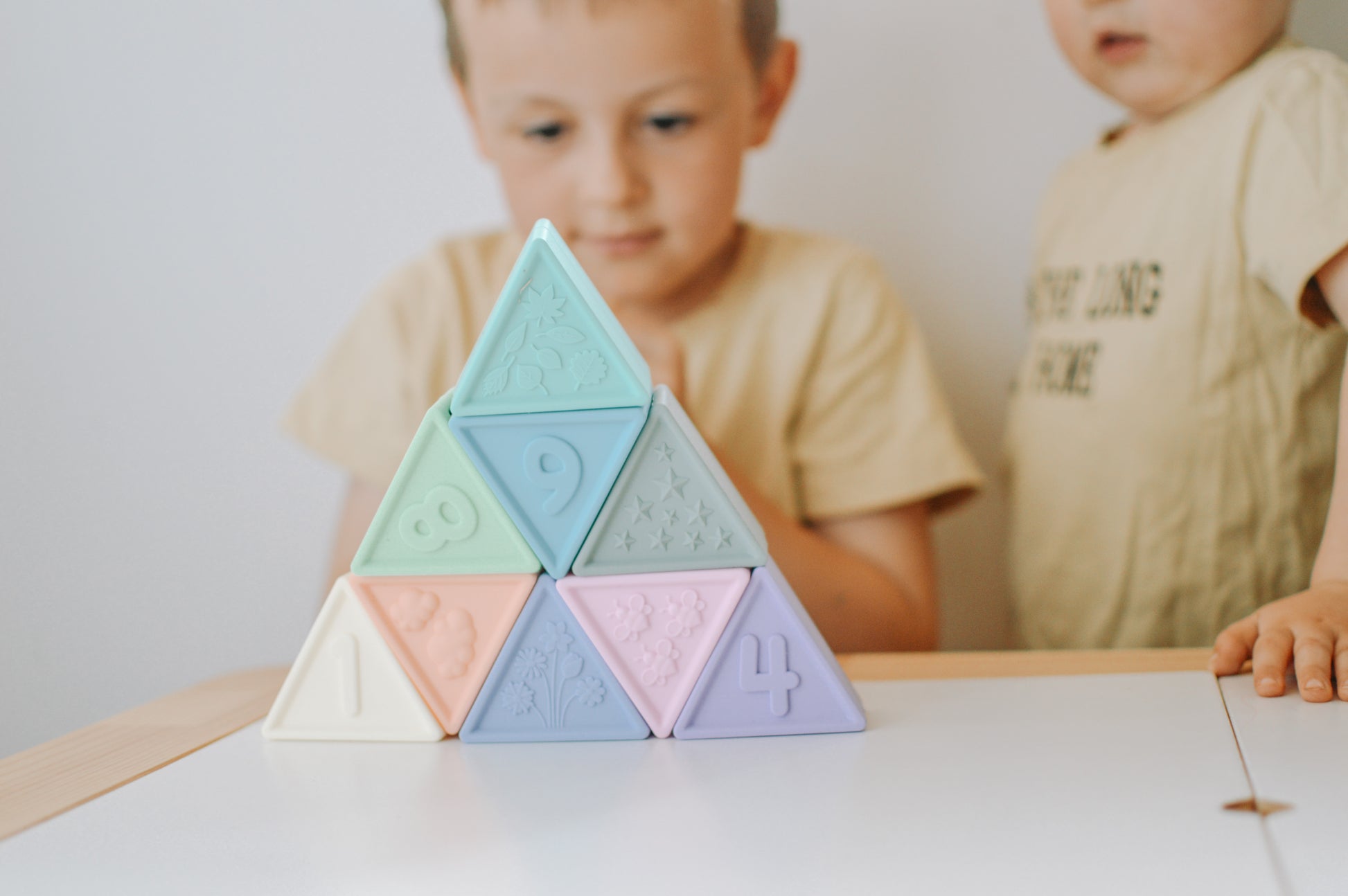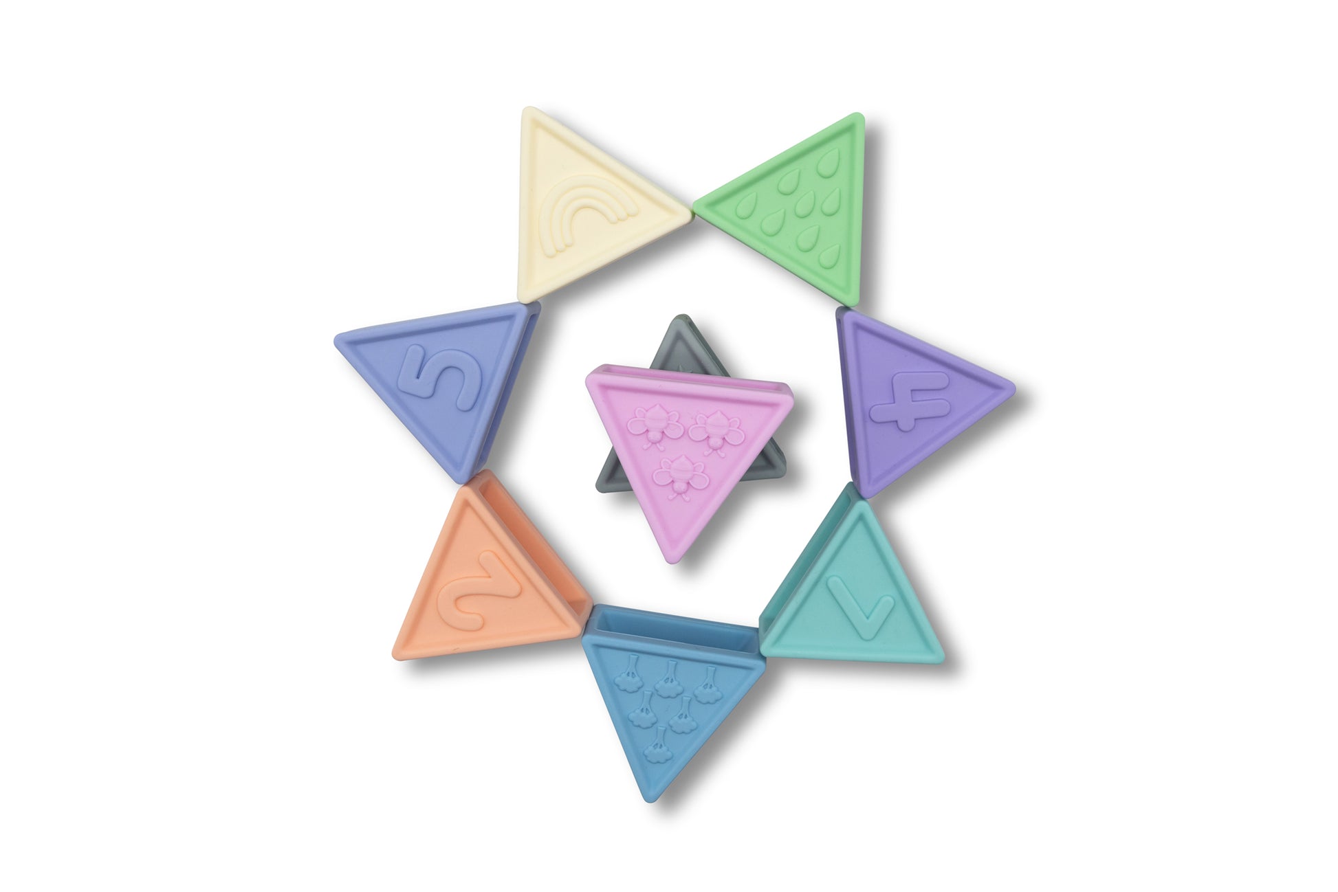 Introducing Jellystone Designs' Triblox! 9 Triangle Blocks made from toxic-free silicone that little ones can use to build, stack, and learn. Perfect for open-ended play, each colorful block features a number and corresponding illustration on the other side for added learning opportunities. Triblox is an excellent way for little ones to channel their own creativity and direct their own play! It was also selected as a Mom's Choice Award Gold Award Winner 2023.