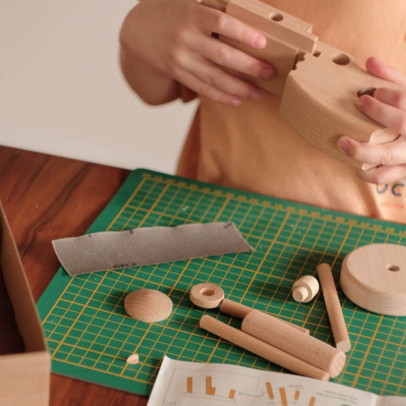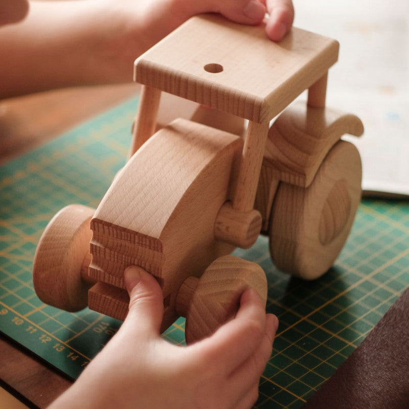 Build your own classic Bajo wooden toy tractor with this solid beech wood construction kit. This Do It Yourself kit includes 25 tractor parts and a step-by-step instruction booklet.